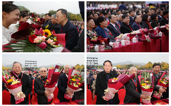 大会现场播放了国外友好学校代表、学校第一所孔子学院合建高校——韩国又石大学校长南天铉的祝福视频。青年学生代表向学校老领导、老教授、国家级人才称号获得者、全国模范教师、外籍专家代表献花,衷心祝愿全校教职工和离退休老同志身体健康、万事如意。