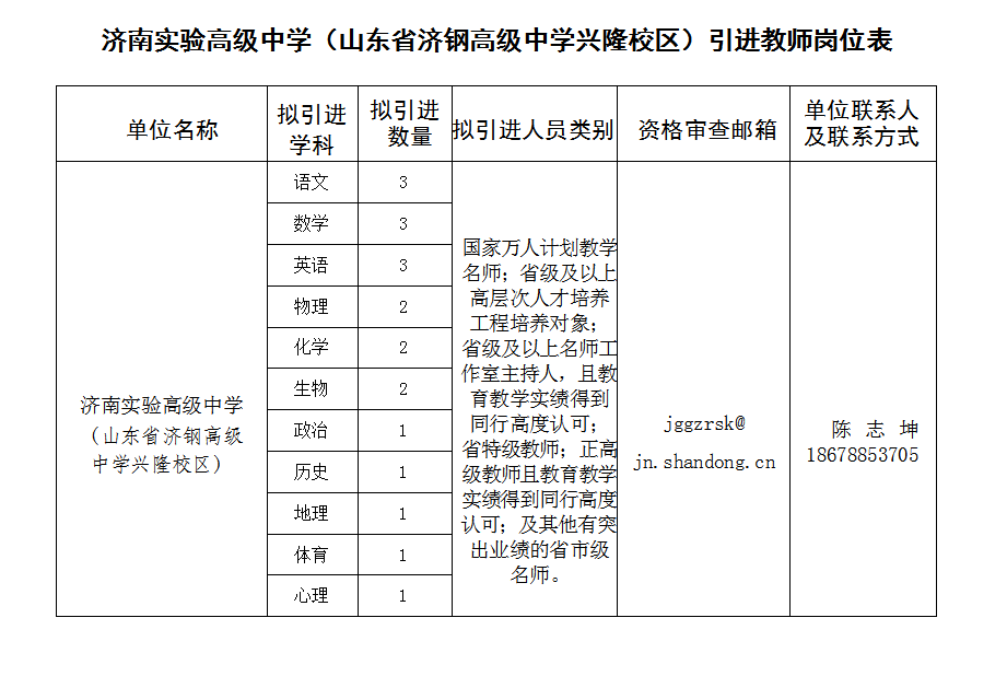在济南实验高级中学(山东省济钢高级中学兴隆校区)列出的“拟引进学科”中,有语文、数学、英语、物理、化学、生物、政治、历史、地理、体育、心理等11个学科,拟引进高层次人才20人。