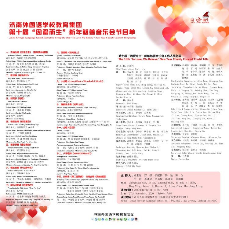 “截至今天15:00,济南外国语学校教育集团第十届“因爱而生”新年慈善音乐会共募集善款887550.89元!”