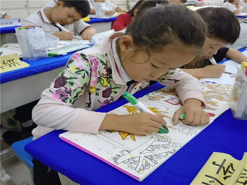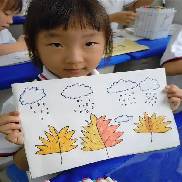 同学们拿起画笔,时而静静思考,时而认真作画,时而窃窃私语。不一会儿,同学们的画本就“变”出了一幅漂亮的图画、有五颜六色的花朵、茂盛的树木、形状各异的枫叶等等,它们在同学们稚嫩的画笔下变得生动可爱。