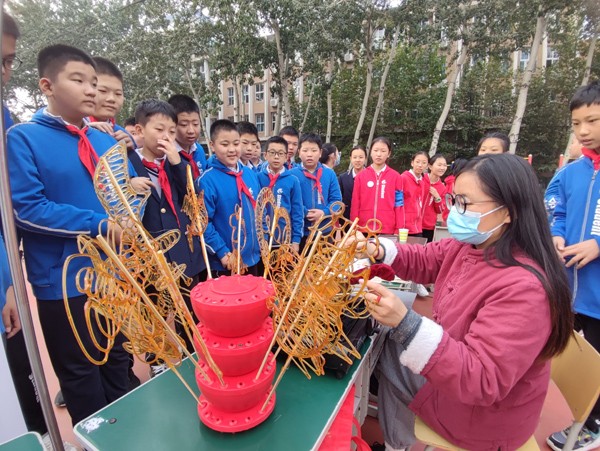 除了在活动主会场的皮影戏、快书、古琴演奏等节目展示外,学校还邀请非遗传承人与学生面对面授课,详细介绍泥塑兔子王、桥式木作、烙画艺术和济南面塑四项非遗文化。学生们充满兴趣与好奇心,有的还在课下围着艺术家们追问烙画技艺的细节等问题。副校长韩卫表示,本次活动能够让学生们了解中国博大精深的传统文化,了解校园之外的精神文明。“学生有机会与艺术家们一起沟通、交流,亲身体验,亲手勾画兔子王、捏面塑等,在亲密接触中更加深刻地感受到文化的魅力。也希望能够通过这样的活动,让学生对文化更加充满自信。”