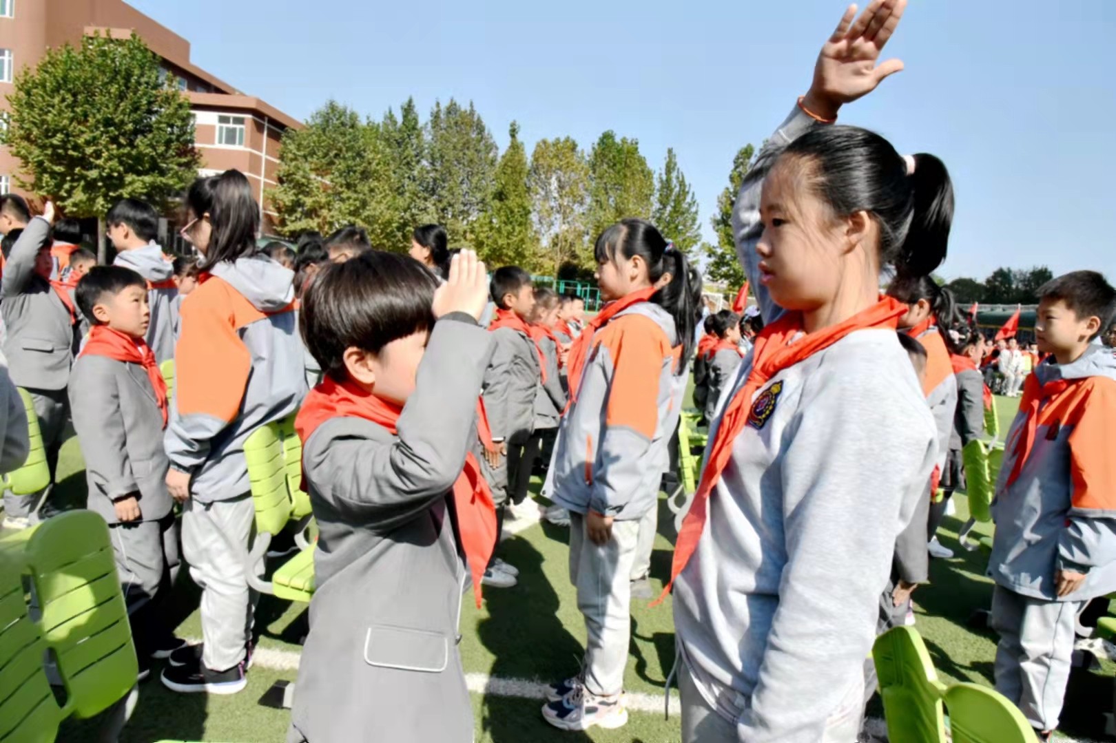 五六年级优秀少先队员代表为新队员佩戴红领巾!