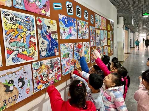 济南市泉景中学小学部的孩子们结合寒假特色实践作业,在美术老师的指导下,用手中的画笔描绘出一幅幅生动的冬奥盛景。运动健儿们优美矫健的身姿、赛场上激烈紧张的竞技瞬间、敦厚可爱的冬奥吉祥物,全都定格在孩子们的画笔之下,将冰雪运动的激情与活力展现得淋漓尽致。济南市礼轩小学的杨晶月与老师、同学们一起,用彩泥制作了一个直径一米的大地球,并围绕地球的一周捏出了东方明珠、自由女神、金字塔、埃菲尔铁塔等形象。“每一个形象都代表着一个国家,象征着世界的和平与团结。”杨晶月说。济南市师范路小学充满激情的手势舞、济南市燕柳小学的书法作品、济南市仁轩小学的皮影戏等,“冬奥”无一不成为孩子们近期艺术创作的首选主题。
