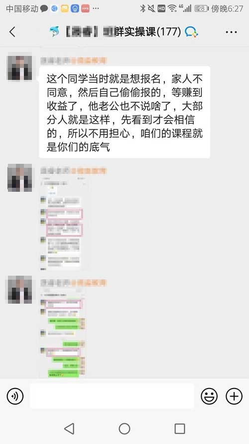 “家人不同意(记者注:报名财商课)太正常了,人之常情。”在课程的最后阶段,微信群内推销进阶课程的信息密度也在不断提升,“班主任”老师还会针对学员报名期间可能遇到的各种顾虑进行分析,同时还举出了学员为了报名进阶课程而“离家出走”,甚至学员偷着用家里的钱报名学习,最终以高额收益取得家人认可的案例。同样的,可信度仍是“存疑”。