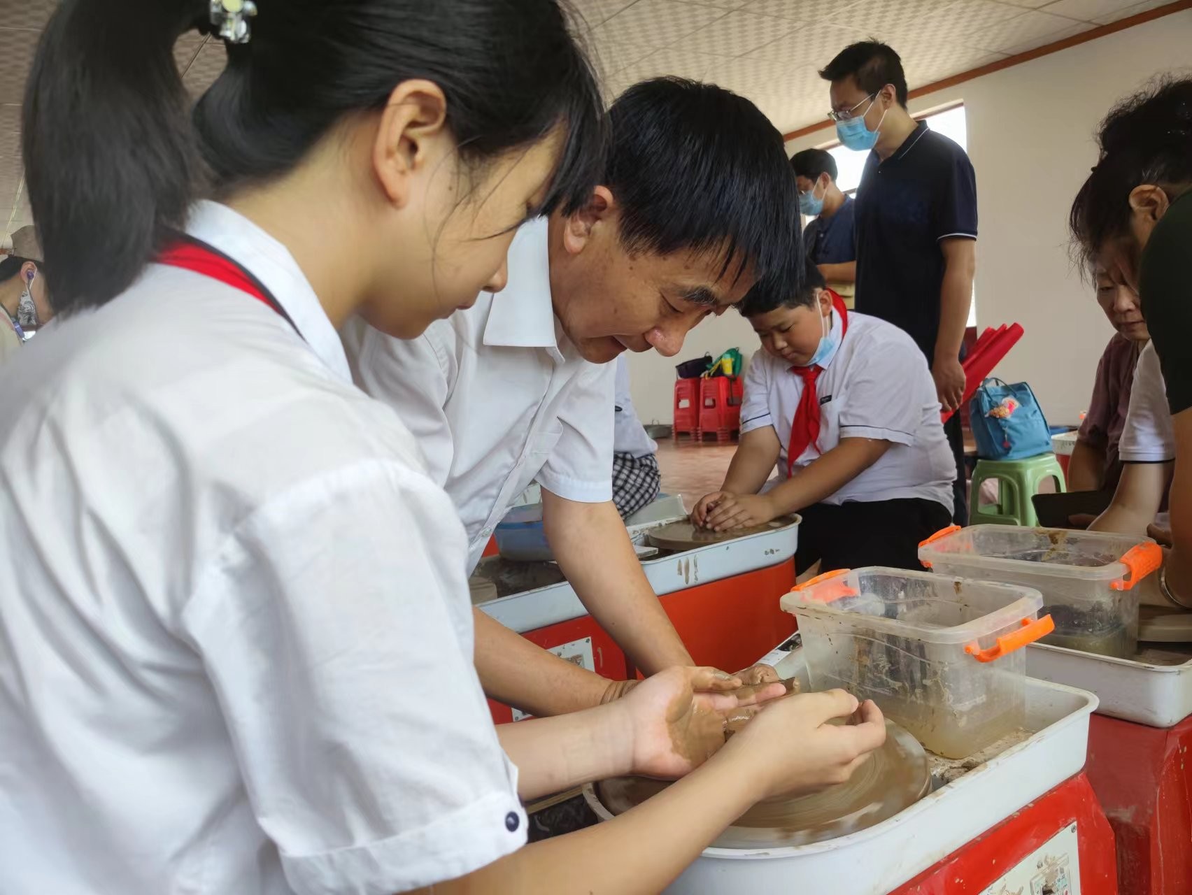 随后,大家还参观了制泥、拉坯、刻花、烧窑等黑陶制作流程,亲自体验了拉坯、压模的制作。在拉坯环节,小朋友们坐在拉坯机器旁边,双手紧握在陶土上,认真感受着陶土的重心差异和形态变化。