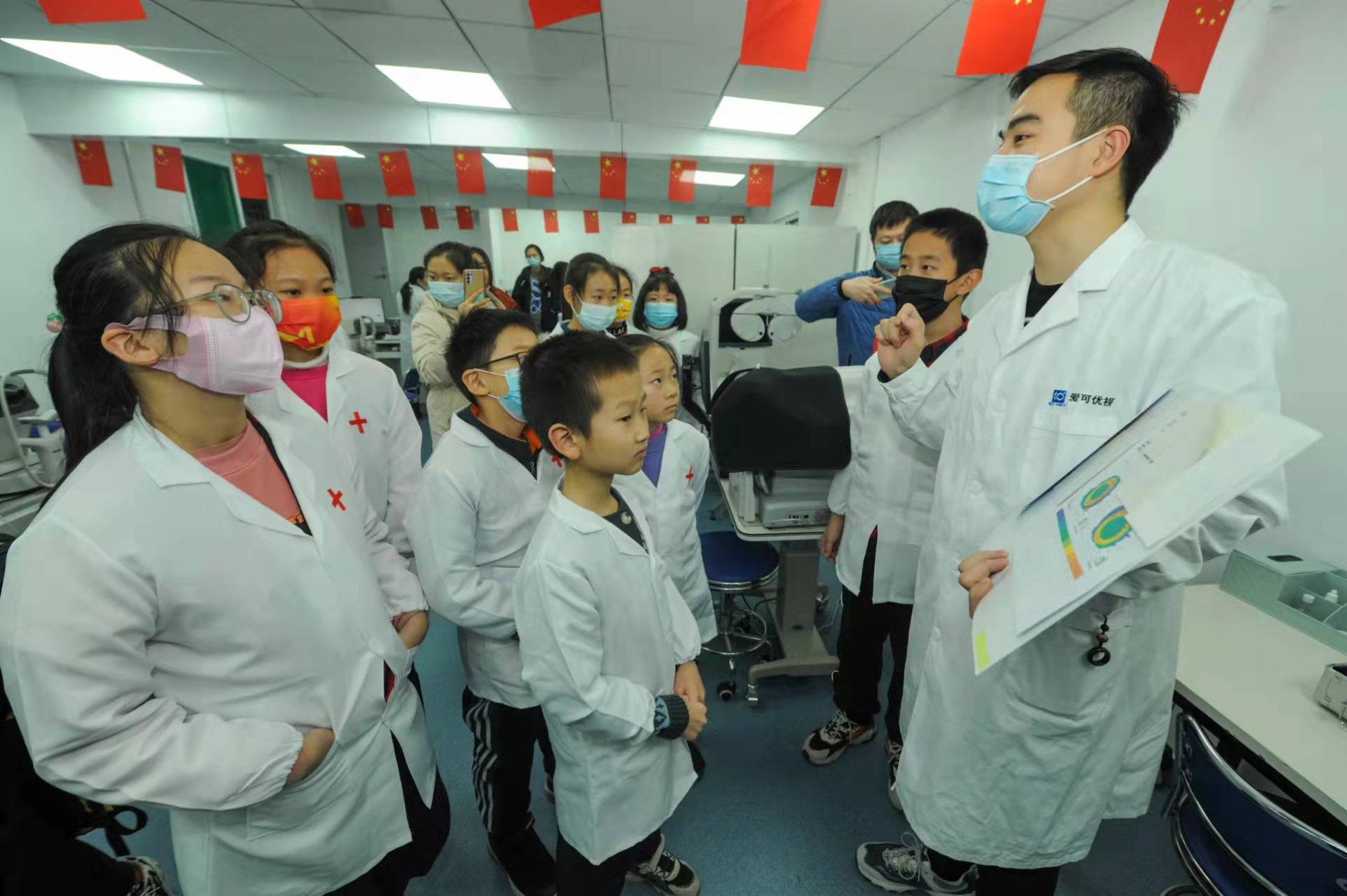“看到了吧,这个是黑眼球,这个是白眼球。”“你的右眼视力是1.0,左眼视力是0.9,平时得注意用眼姿势了。”爱可优视医学视光中心主任袁壮为小记者们介绍不同测量仪器的功能,一边教“小医生”如何操作仪器、查看检查结果,一边告知被检查人员的视力情况、做出提醒。