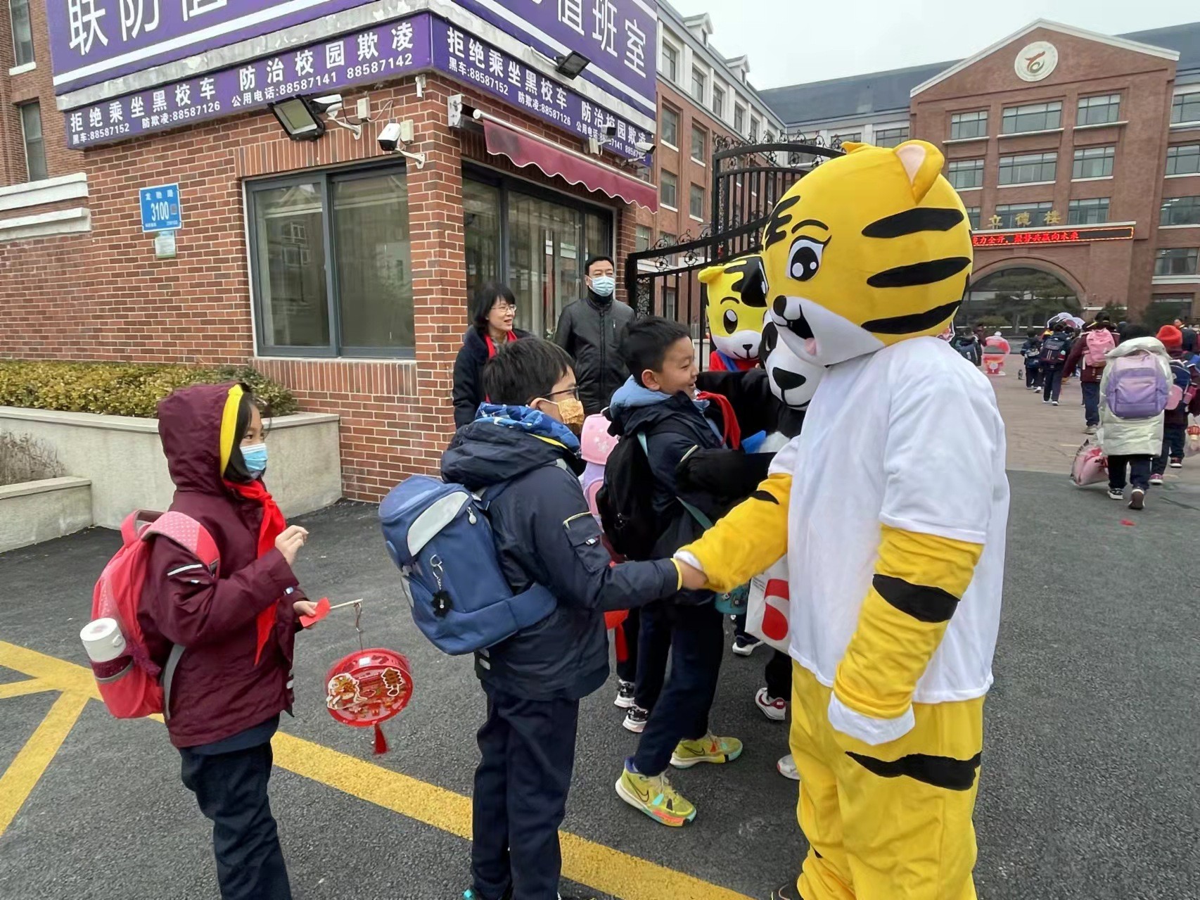 2月16日,小老虎公仔、小熊猫公仔早早地等候在济南市龙德学校门口,给孩子们送上第一份新春的祝福。