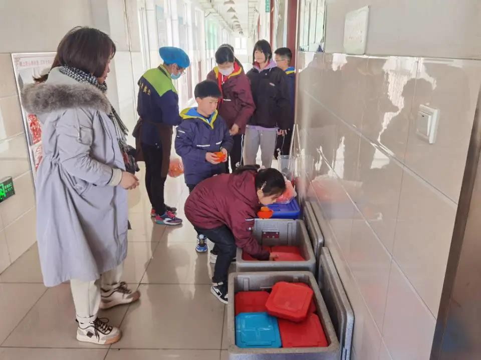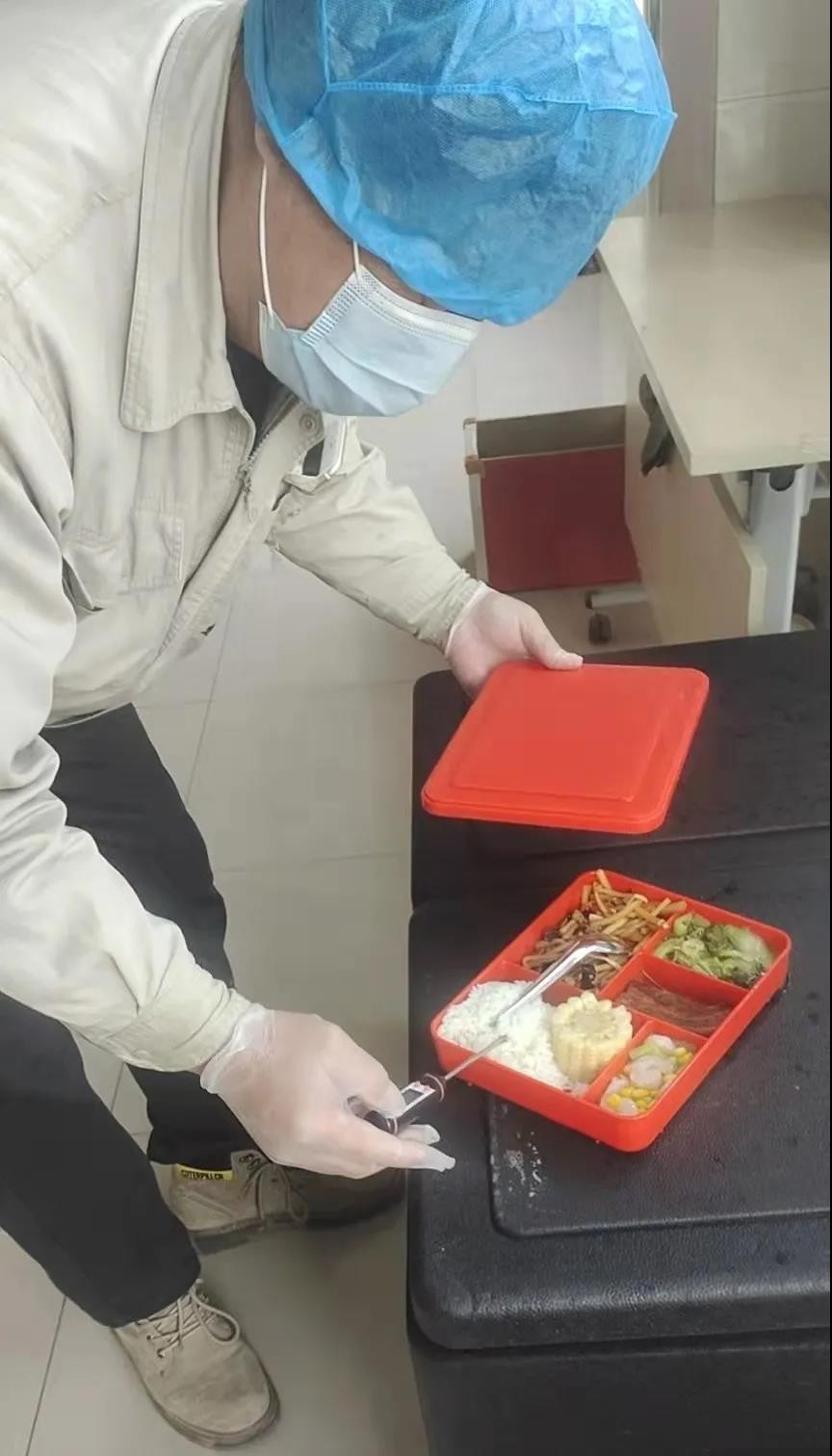 上午11点10分,送餐专用车准时到达。学校接餐人员对保温箱密封情况进行核查后,随机抽查餐盒,对餐品进行现场检查及中心温度测量,并对当天餐品进行登记和留样。