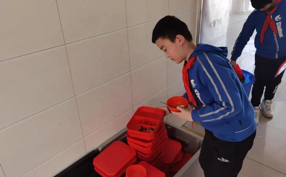 就餐学生在老师的组织下有序领餐,根据自身需要在老师的指挥下进行自主加餐。就餐过程中,老师提醒学生勤俭节约是中华民族传统美德,每一粒米、每一道菜都凝结着很多人辛勤的汗水,节约粮食永不过时,要爱惜粮食、践行“光盘行动”。此外,学校还围绕“提高学生自我管理能力和自我服务能力”进行行为习惯养成教育,根据学生年龄特点进行公共场合礼仪常规教育,开展文明用餐文化教育,让一餐一饭充满积极的教育元素。餐后,孩子们自觉将餐余垃圾收拾好、将餐盒放入餐盒回收箱,劳动教育贯穿在整个用餐过程,突出劳动价值观的培养,强化了个人生活能力和习惯养成。