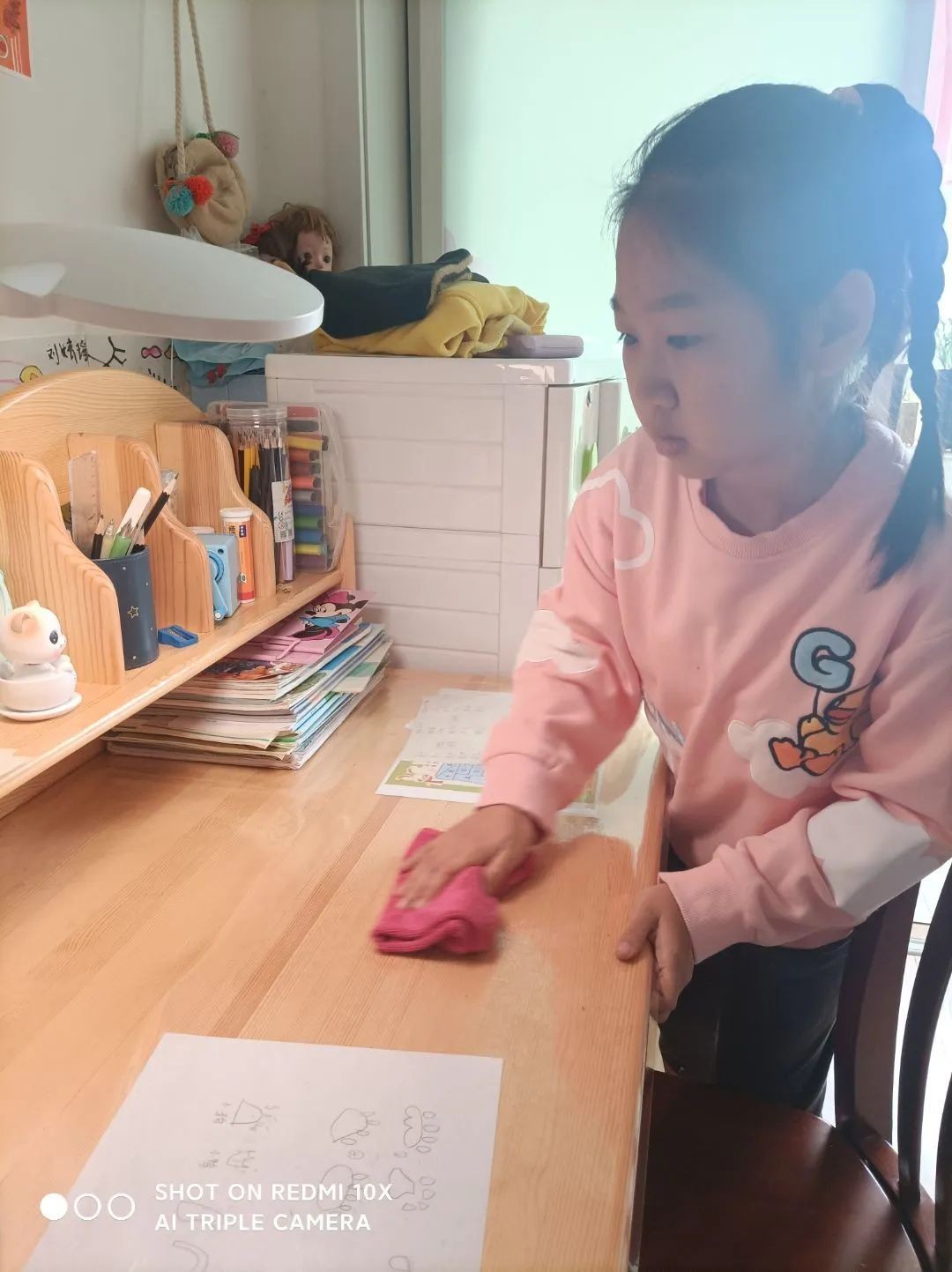 二(1)中队的队员们不仅能收拾好自己的房间、书桌、学习用品,还能收拾杂物,清扫地面垃圾、擦桌子等,帮助父母做些力所能及的家务活。在居家不能出门的日子里,趵小学子们不仅关注疫情发展,坚持学习和锻炼身体,还积极学习多方面的劳动知识,主动打扫卫生,做饭做菜……看他们认真的样子,一定能够体会到劳动的辛苦和父母的不易。疫情当前,生活空间虽然有限,但孩子们的生活依然可以过得多姿多彩!
