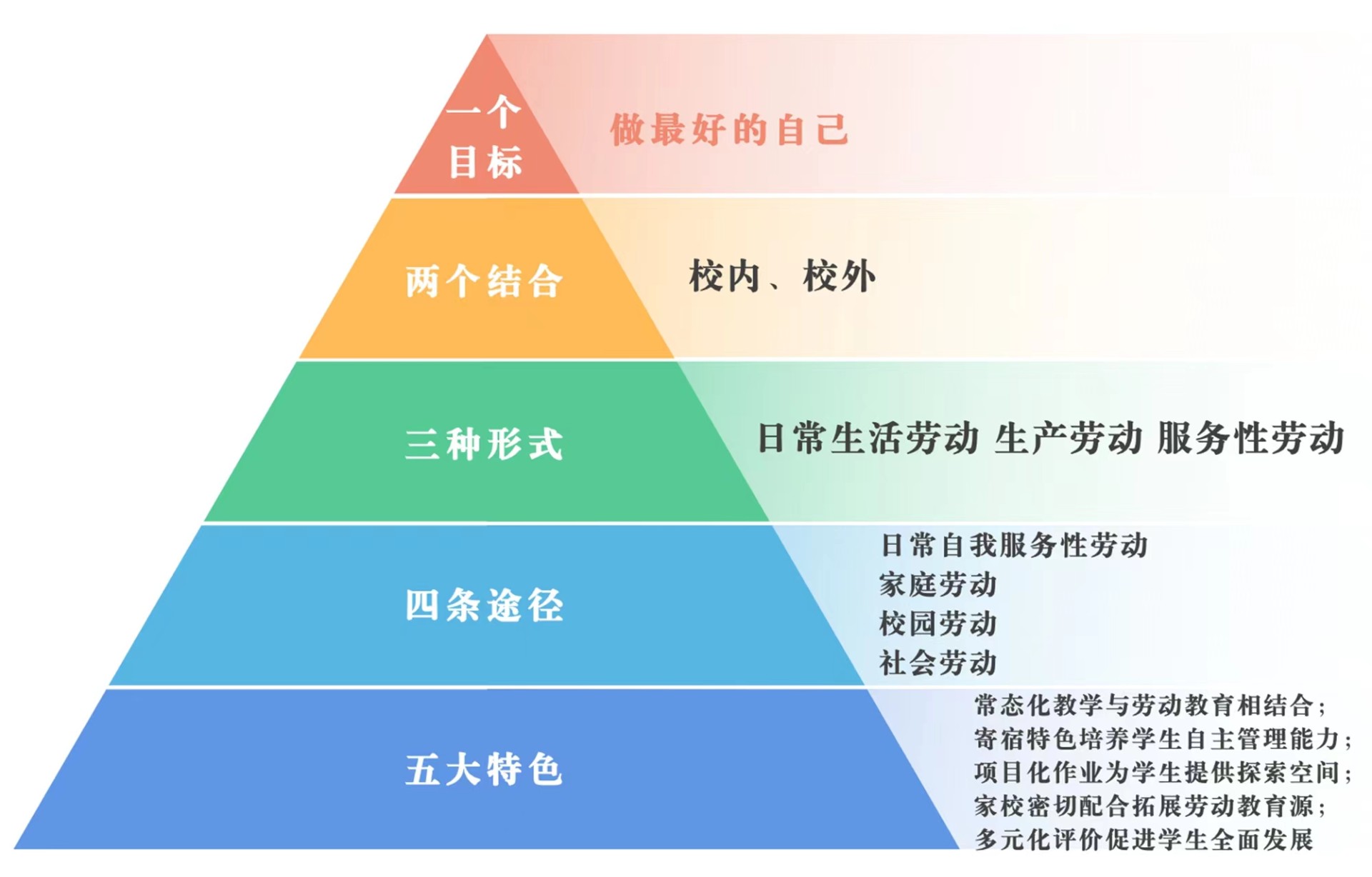 劳动教育的目的在于引导学生崇尚劳动、尊重劳动,懂得美好生活是靠劳动创造的道理。齐鲁学校的“12345”劳动教育体系以“做最好的自己”作为核心目标,通过校内外两个结合,日常生活劳动、生产劳动和服务劳动三种形式,打通四条实施途径,形成了“劳动教育”的五大特色。