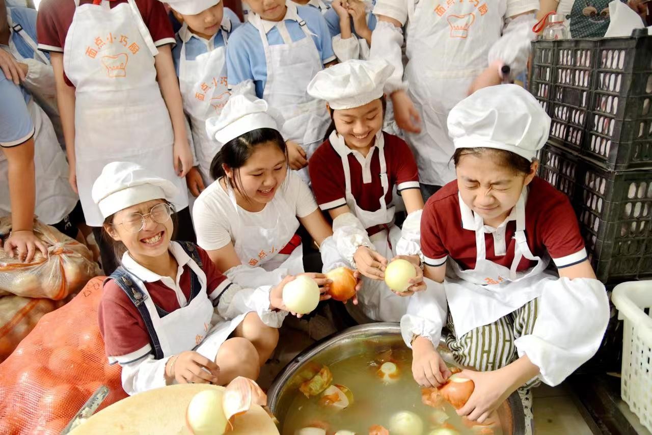 《劳动•自理》课程从刷牙、穿衣、系鞋带到梳头发、叠被子和洗袜子等日常劳动内容,让学生在生活上实现真正的自理。学校每月为1-6年级设立劳动实践日,学生或走进餐厅择菜、做饭、倒汤,饭后刷碗、扫地;或走进各处绿化带,清扫、整理;高年级走进农场,进行专业种植、制作劳动工具等体验。劳动实践日让学生在体验中感受劳动的艰辛,在汗水中体会劳动的喜悦。