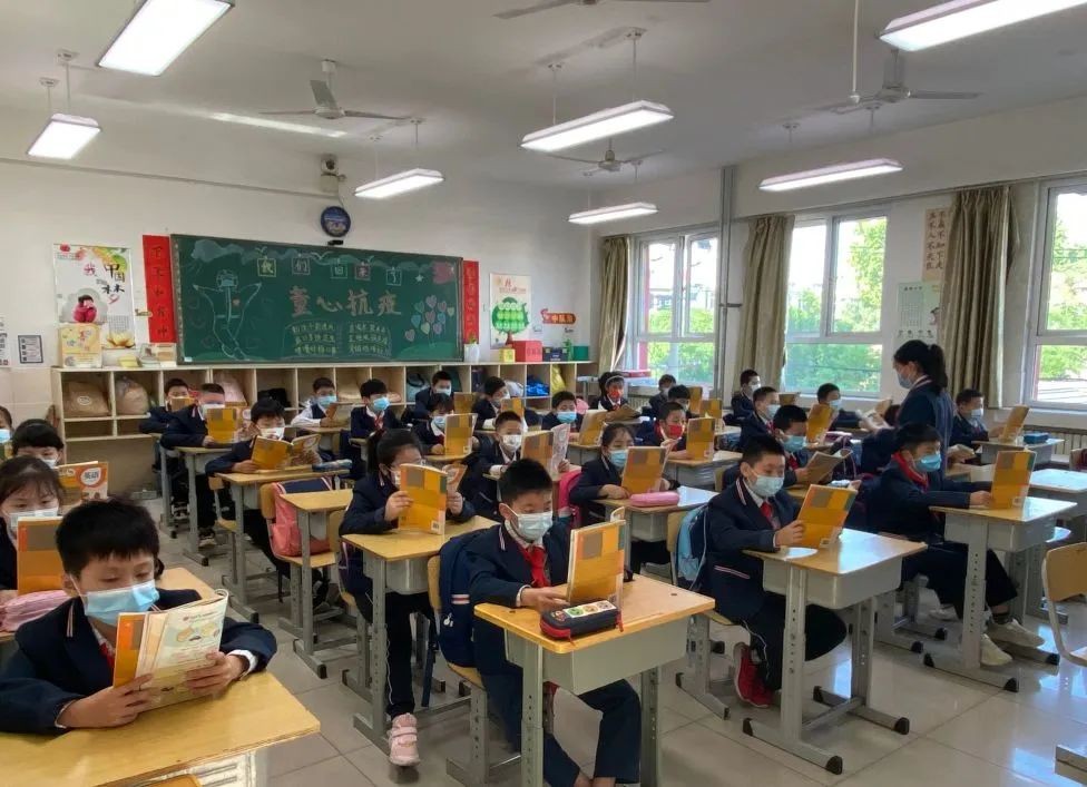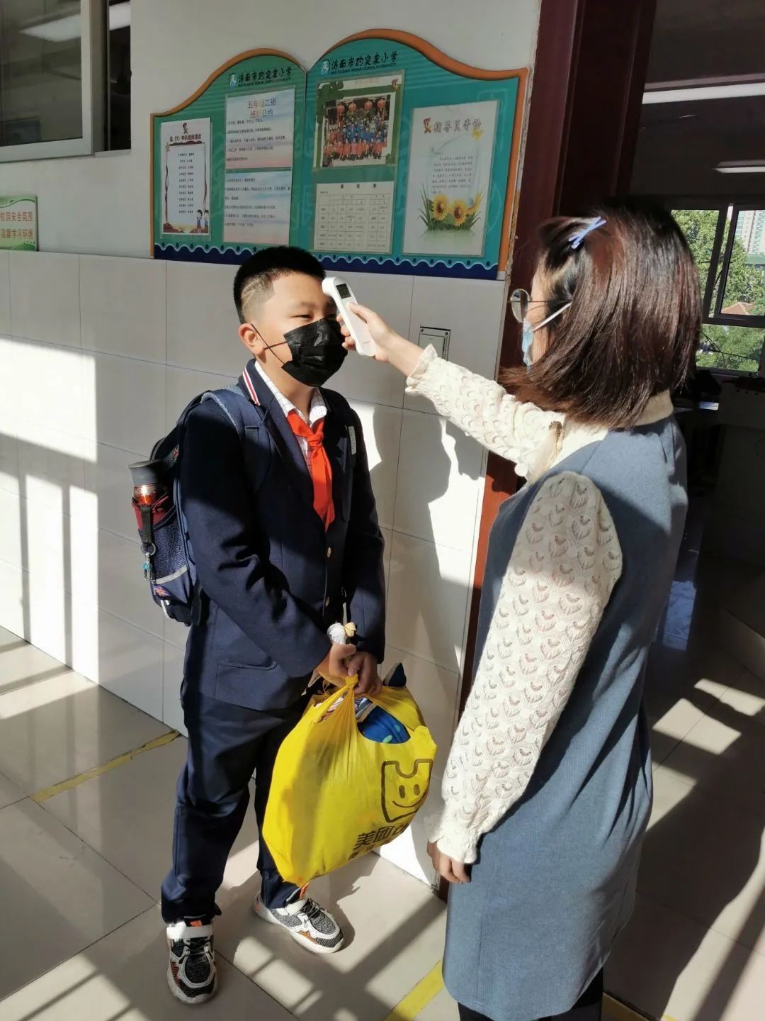 干净明亮的教室早已经过老师的消毒通风,班主任老师站在班级门口,孩子们戴好口罩,间隔一米距离排队,通过第二次体温监测后进入教室。琅琅的书声响起,校园里处处忙碌、欢乐的场景在此时显得万分珍贵。