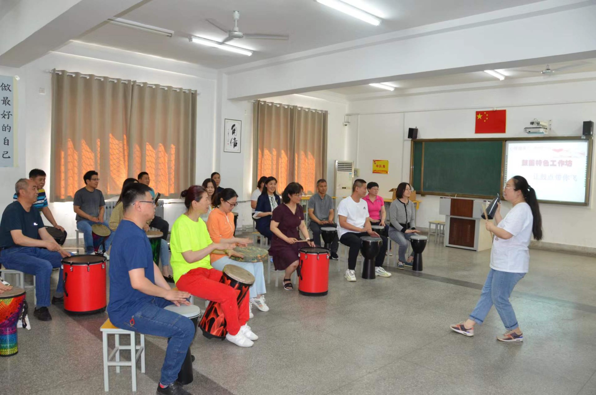 在学校专职心育教师刘颖的指导带领下,老师们沉浸在鼓圈特色工作坊中,用激扬的鼓点释放压力、舒缓情绪,感受音乐与律动的魅力。