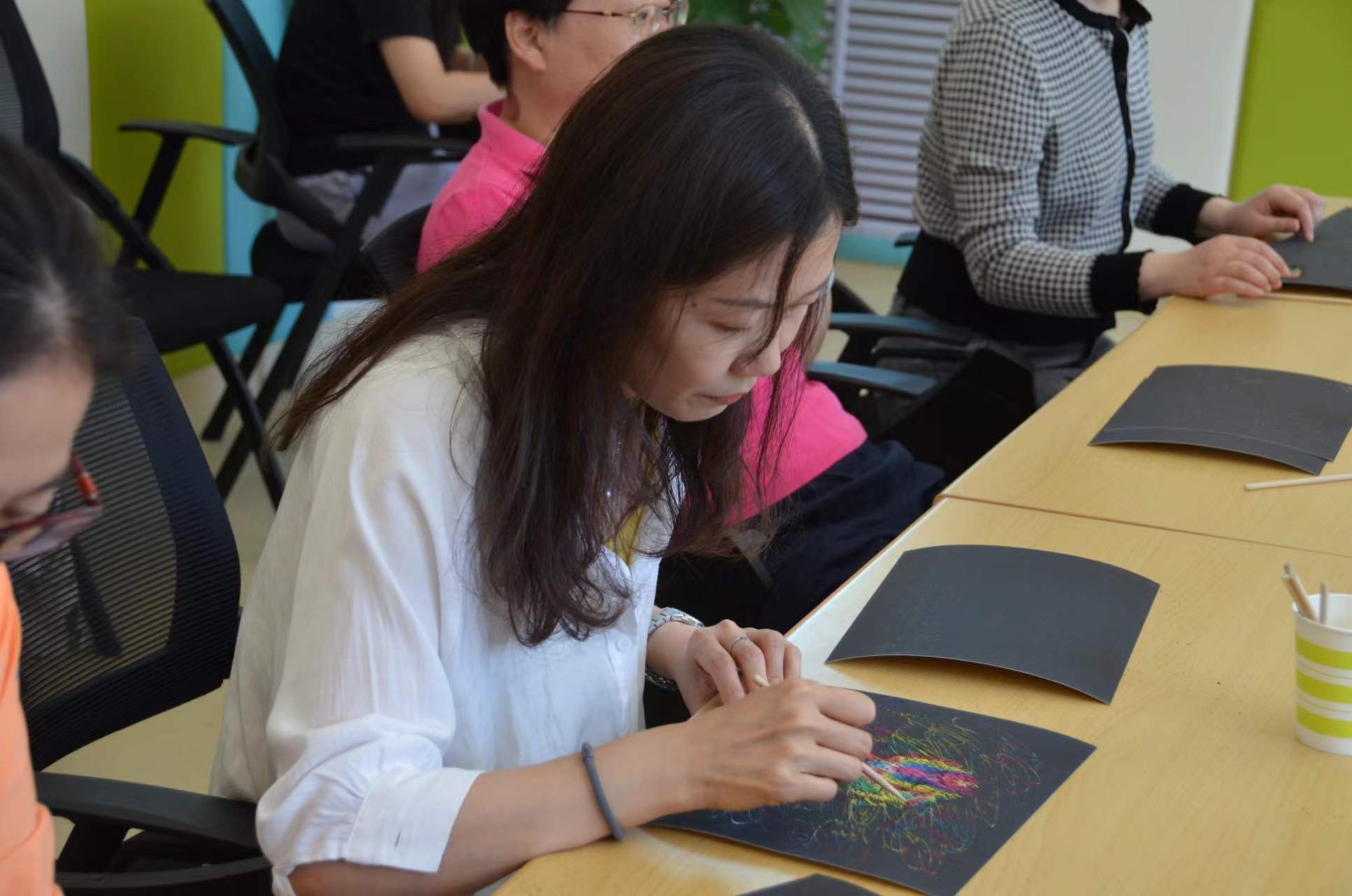 在学校心理辅导中心团体工作室,老师们发挥相像力用竹笔在专用双层炭纸上创作出一幅幅各具特色的多彩刮画,于专注中遇见惊喜,于探索中提升自信。