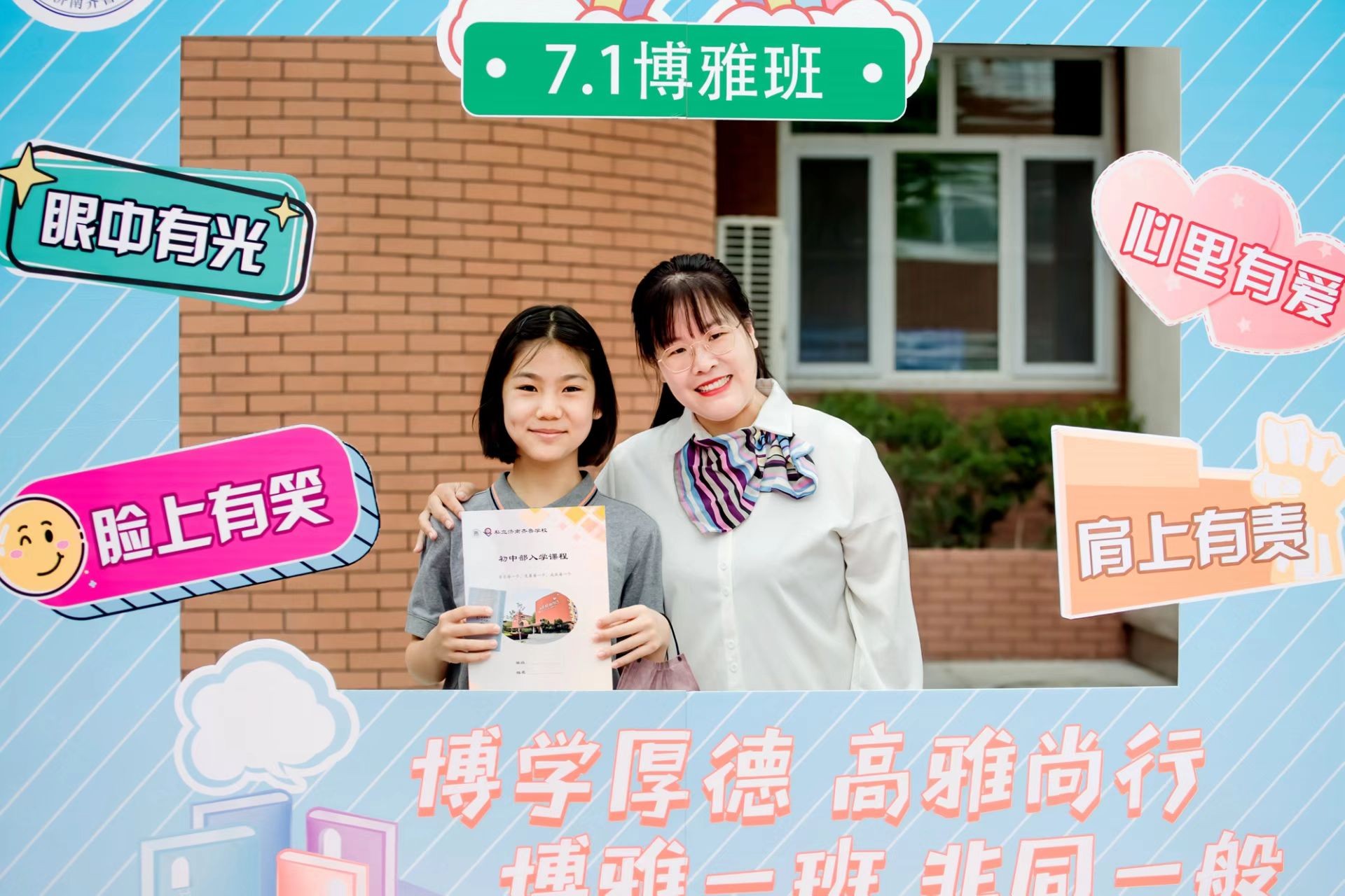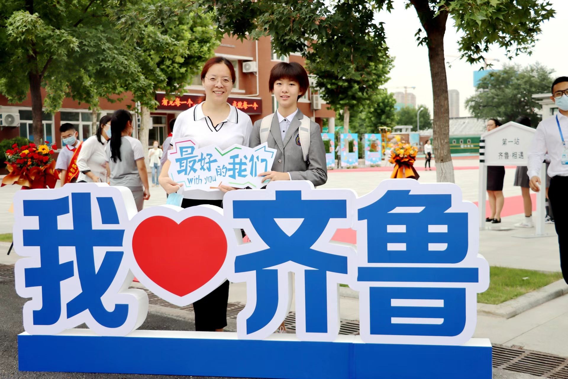 学生和家长合影后,初中部副校长崔明雪将“我是中学生啦”贴在学生胸前,学生们迈着铿锵的步伐走向未来,开启了初中新生活。齐鲁学校副校长、初中部校长于玲将开往未来的齐鲁“G2022”号列车车票亲手交给每一个学生,希望他们能够心怀希望,驶向远方。齐鲁学校校长孙艳梅在第三站静候,亲手将《入学课程》送给学生,鼓励他们成为齐鲁“四有”少年,做最好的自己。第四站属于四位班主任们,她们在中学门前为学生佩戴精心准备的小徽章,并与他们合影留念,祝愿他们未来三年,不惧风雨,一路向阳。
