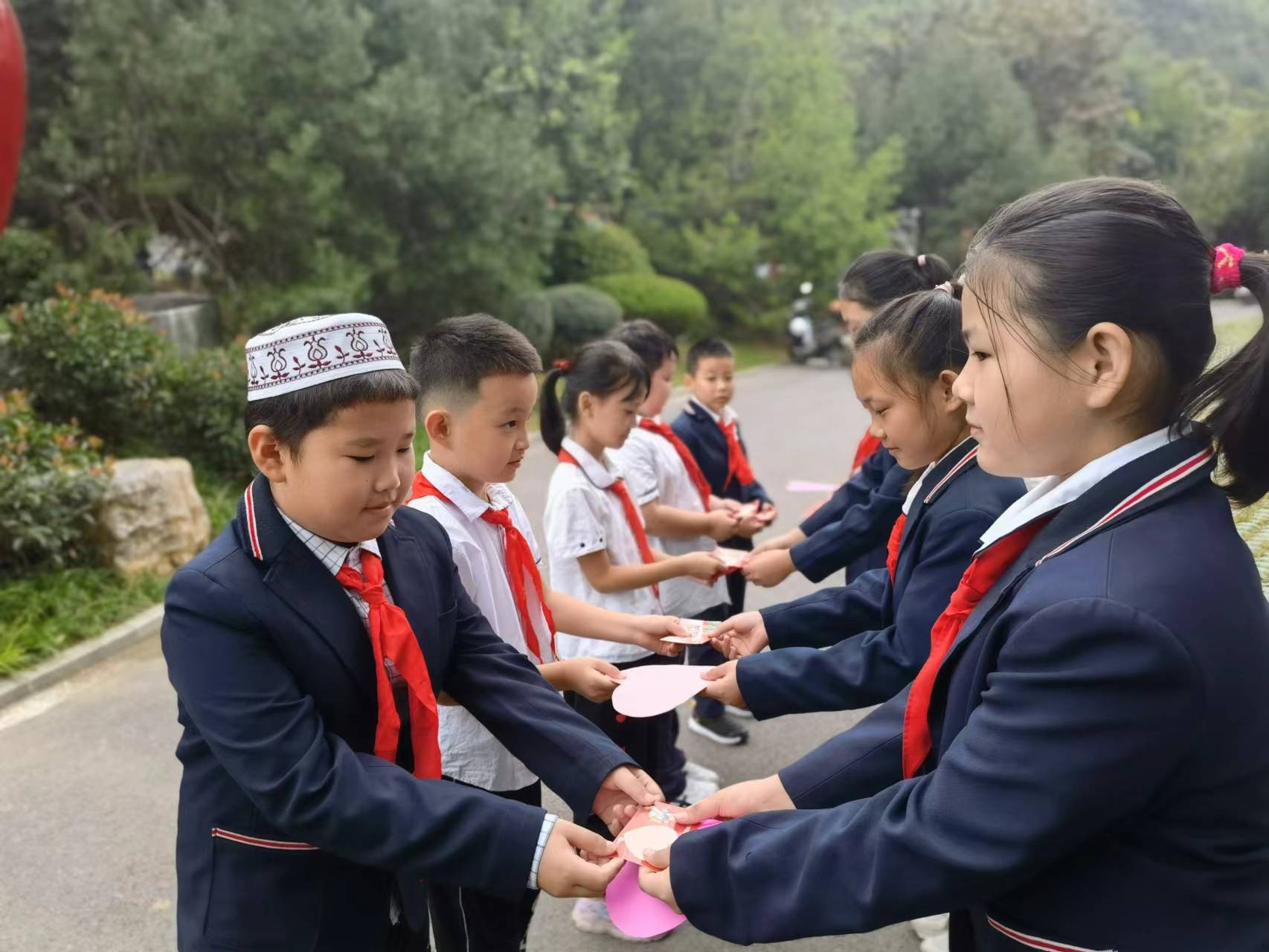 活动中,队员们站在“彤铸历下石榴红”的民族团结宣传栏前,畅谈对民族团结重要性的认识以及今后自己会如何行动来促进民族团结。队员们来到民族特色牌前,聆听着少数民族队员对自己民族文化的介绍。辅导员老师告诉队员们,在中华民族大家庭中,56个民族都要像珍视自己的生命一样珍视民族团结,像相互依存的石榴籽一样紧紧抱在一起。不同民族的队员们互赠手中的心愿卡,将自己美好的心愿和祝福送给对方,纯洁的友谊和深深的民族情谊寄托其中。