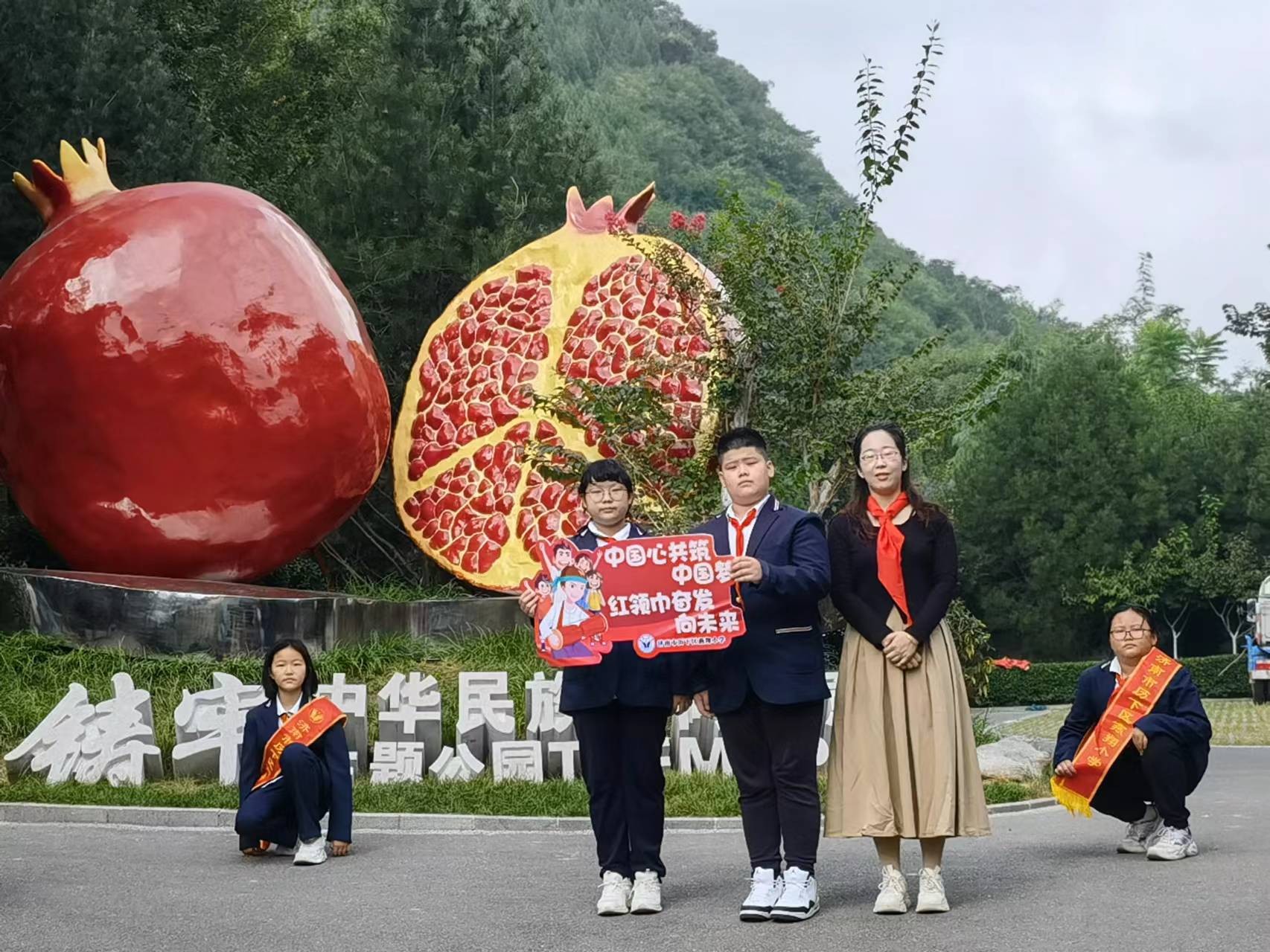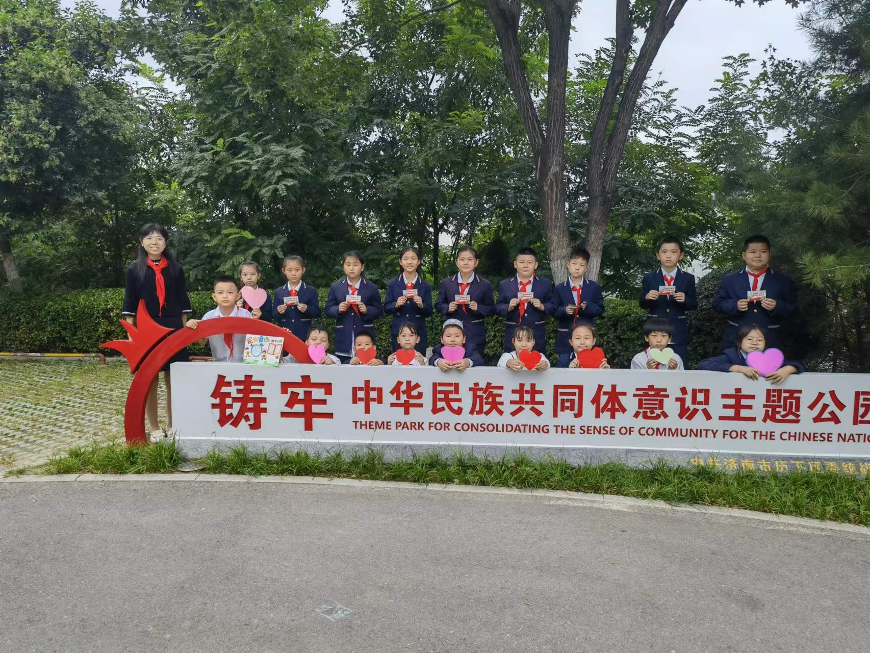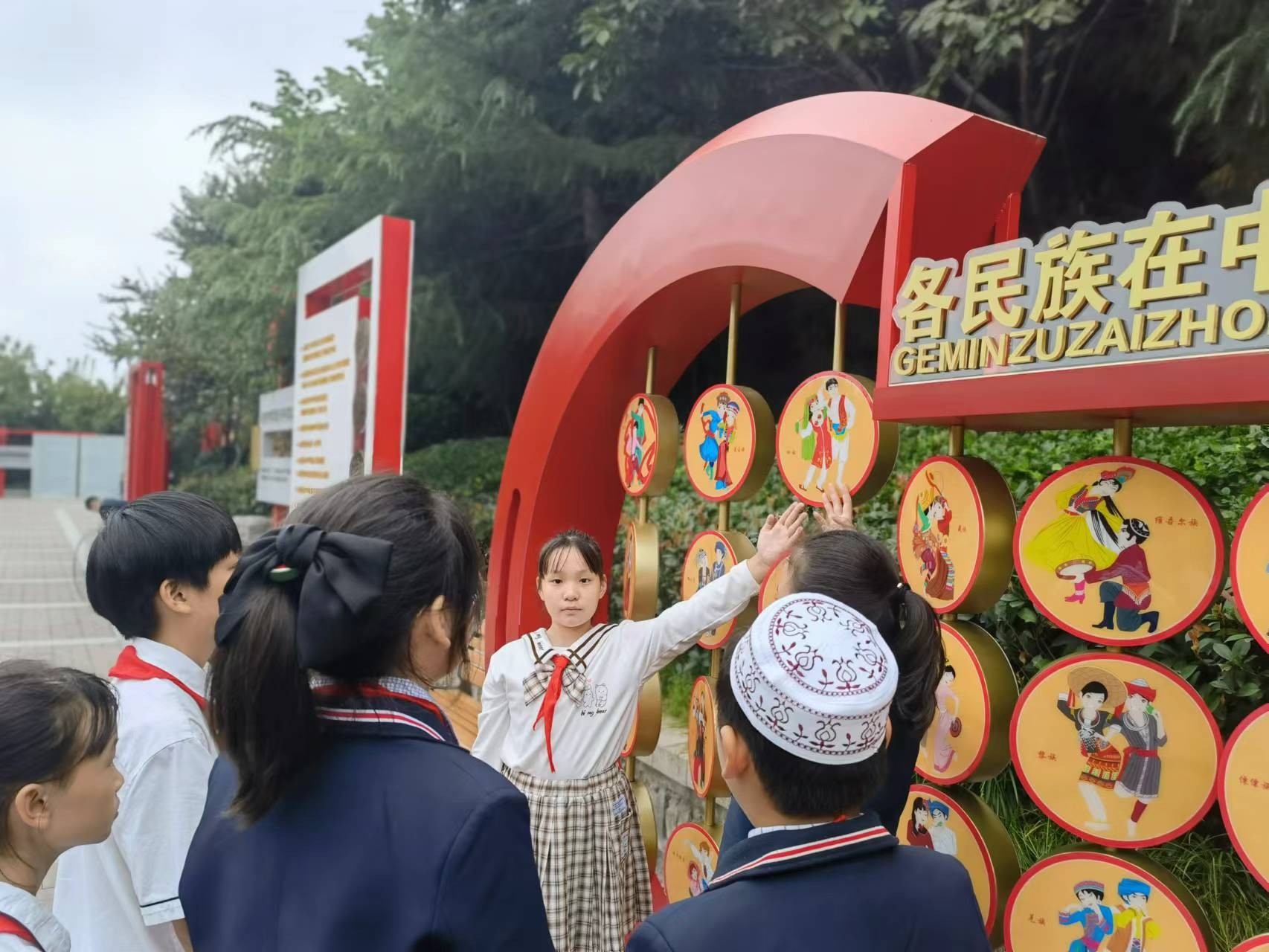 五(4)中队的队员们在大队辅导员陈雅涵和中队辅导员韦安欣的带领下,来到了燕翅山上的铸牢中华民族共同体意识主题公园。行走的少先队活动课,让每一名队员在参与中体验,在感知中成长。队员们在一个个民族故事中,体会到了民族团结的重要性,他们深深地懂得,56个民族的中华儿女要像石榴籽一样紧紧拥抱在一起,生死相依、荣辱与共。