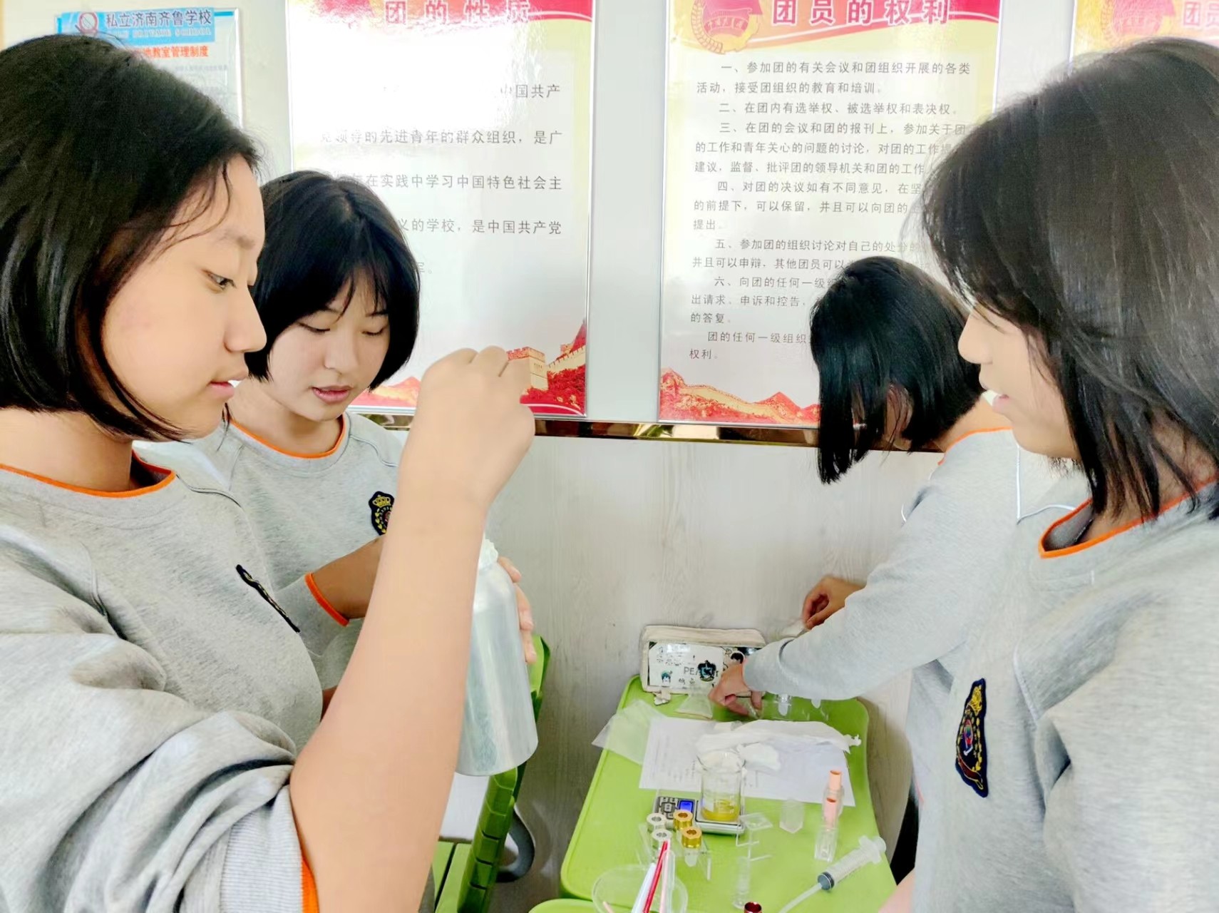 随后,学生们怀着激动的心情带着实验器材走进课堂,在老师的指导下,他们选材、计算、配料、制作,无不彰显着科学严谨的态度,那些未来可能出现在书本中的知识已经在实践中释放着魅力。当然,在制作的过程中也会出现这样或者那样的失误,但在廖爽老师的指导下,孩子们都一一克服了,在万众期待中,“齐鲁牌”护手霜、润唇膏制作成功啦!