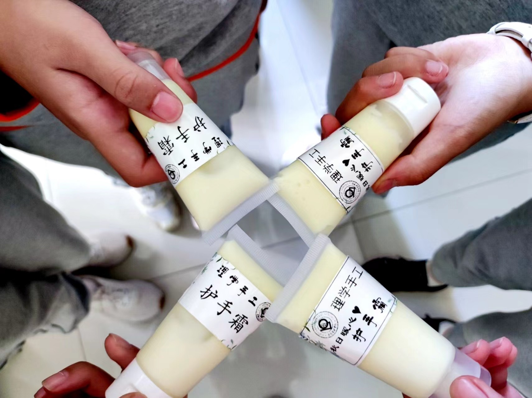 学生们迫不及待的带上自己的作品送给最爱的老师们,护肤品滋润着肌肤,浓浓的爱意温暖着人心!此次活动也让孩子们有了自己的感悟,7年级徐鹤宸说:“有人会动手制做美味的食物;有人会动手做出自己喜欢的衣服;有人会绘制赏心悦目的画作。而我期待的每周二的理学手工课可以制作护手霜、润唇膏,想到可以把自己做出护手霜送给妈妈,心里别提多高兴啦!”7年级孙雅轩则表示,几周以来,自己在理学手工的课堂上收获颇多,认识了许多实验器材,也和同学们一起尝试做了护手霜。“没想到生活中常常见到的护手霜,它背后的原理竟然是这般复杂。虽然第一次尝试时,出了许多插曲,以至于最后的成品也有些不尽人意,但是这周我们吸取教训,调整了配方,虽然过程还是有些波折,但最终我们终于做出了非常满意的成品。期待下周的学校课程!”