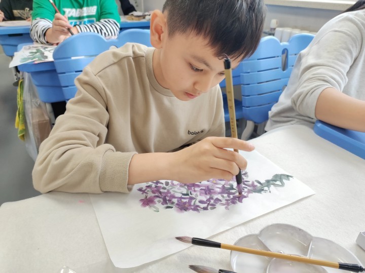 孩子们在中国画学习中,尝试运用毛笔、宣纸,体验着笔法与墨法的巧妙变化,感受着传统工具材料里的中国文化,给自己的画作起一个诗意名称,提款落印之后展示出诗书画印的巧妙融合……瞧,这细致入微的笔触,投入的眼神,孩子们无不沉浸在这传统艺术之中。