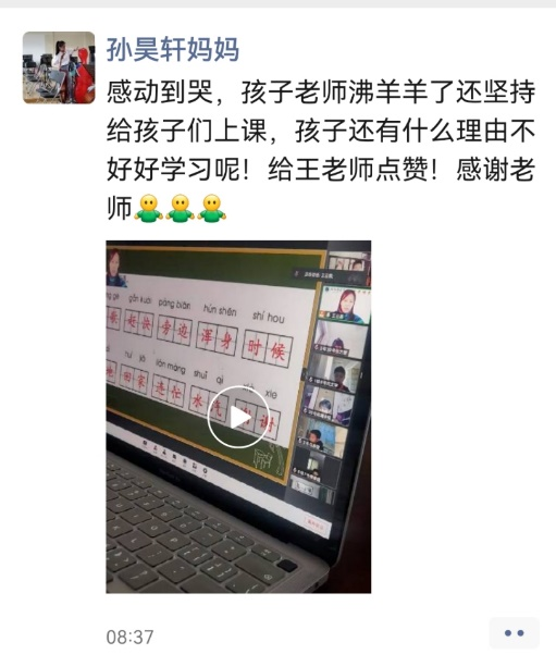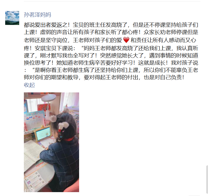 当家委会代表把家长们的意见转达给王老师时,王老师坚决不同意!王老师坚持上课,为了孩子们能持续学习不间断,更主要的是由于她平时一直关注孩子们网课时的表现,并经常与家长们交流,得知部分家长由于上班,家里只有老人陪同孩子上课,甚至班里有的家庭是孩子自己在家上课。如果放手不管,她不放心孩子们的安全,只有通过会议室视频看到孩子们,她的心才踏实。