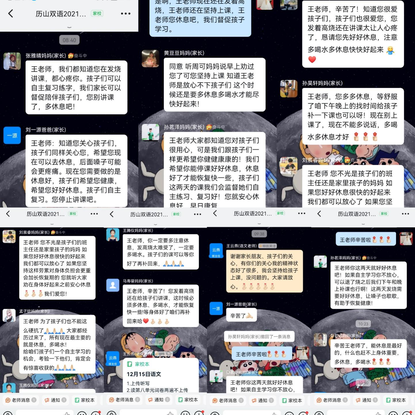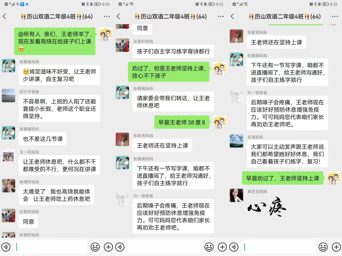 第一节语文课,王云燕老师照例提前来到腾讯会议室检查孩子们的早读,可是等到上课时,细心的家长和同学发现,老师的鼻音很重,且声音沙哑,说话很吃力,有家长悄悄的问家委会,是不是王老师阳了?得到家委会确认的消息后,家长们担心王老师的身体,有的家长知道“阳”过之后的感受,这时候是免疫力脆弱的时候,如果坚持上课,更不利于恢复,何况家里还有个宝宝。家长们一致要求,孩子们自主学习,让王老师休息,只有休息好才能早日康复,更有热心的家长建议一起退出腾讯会议室。