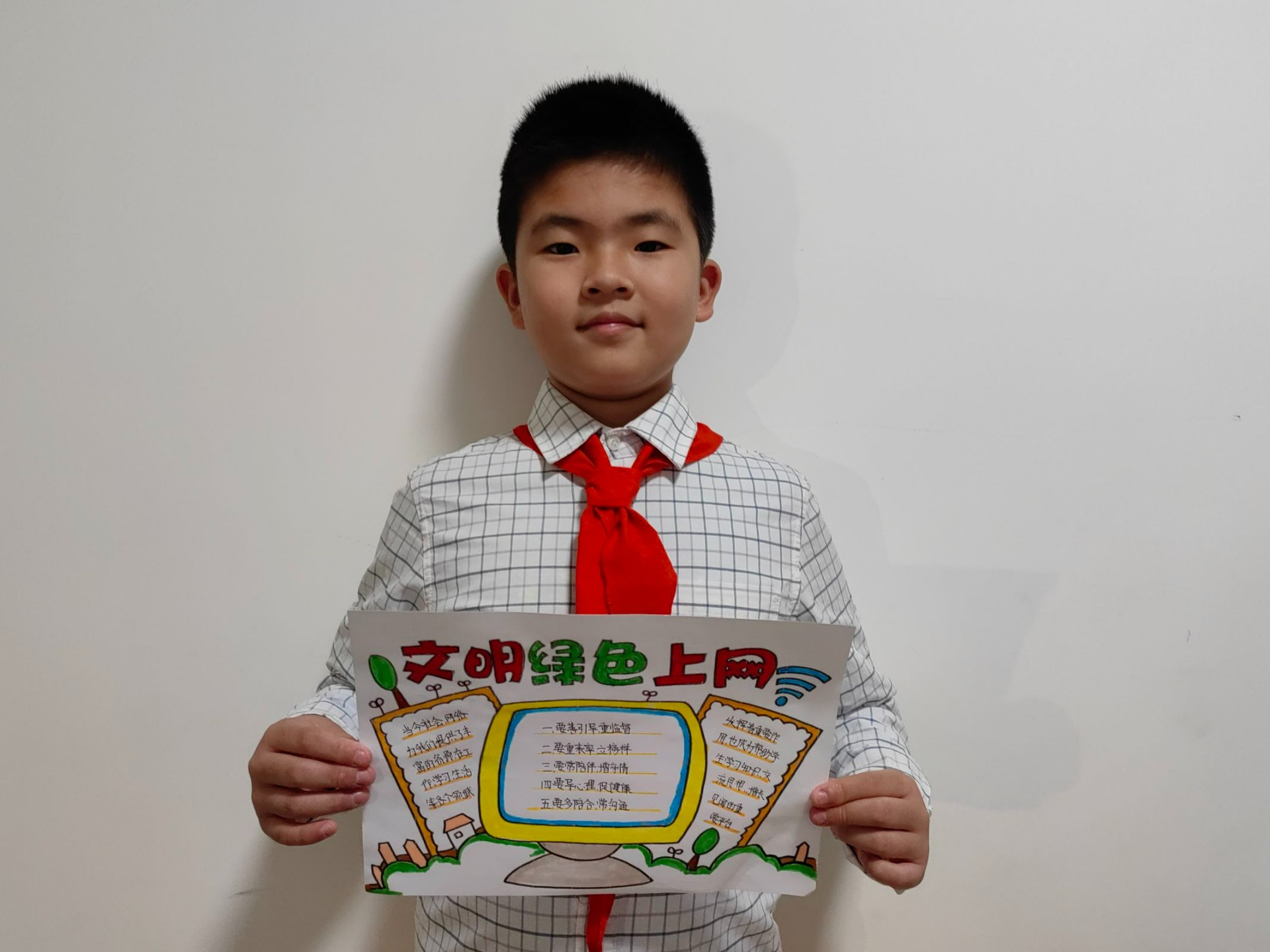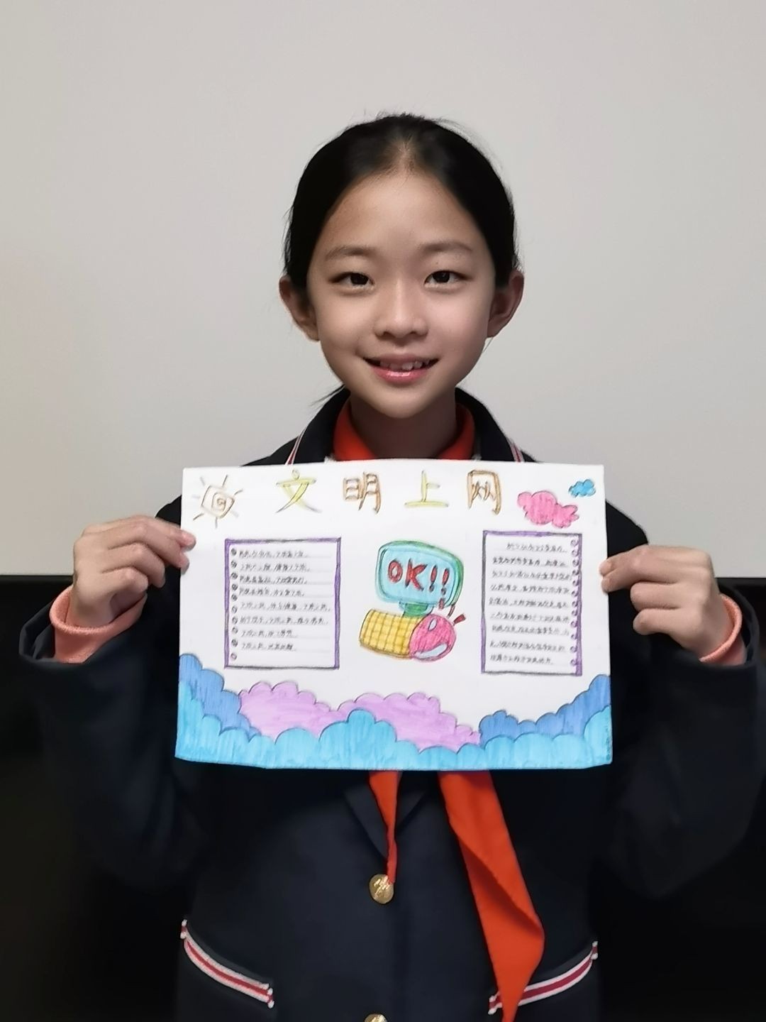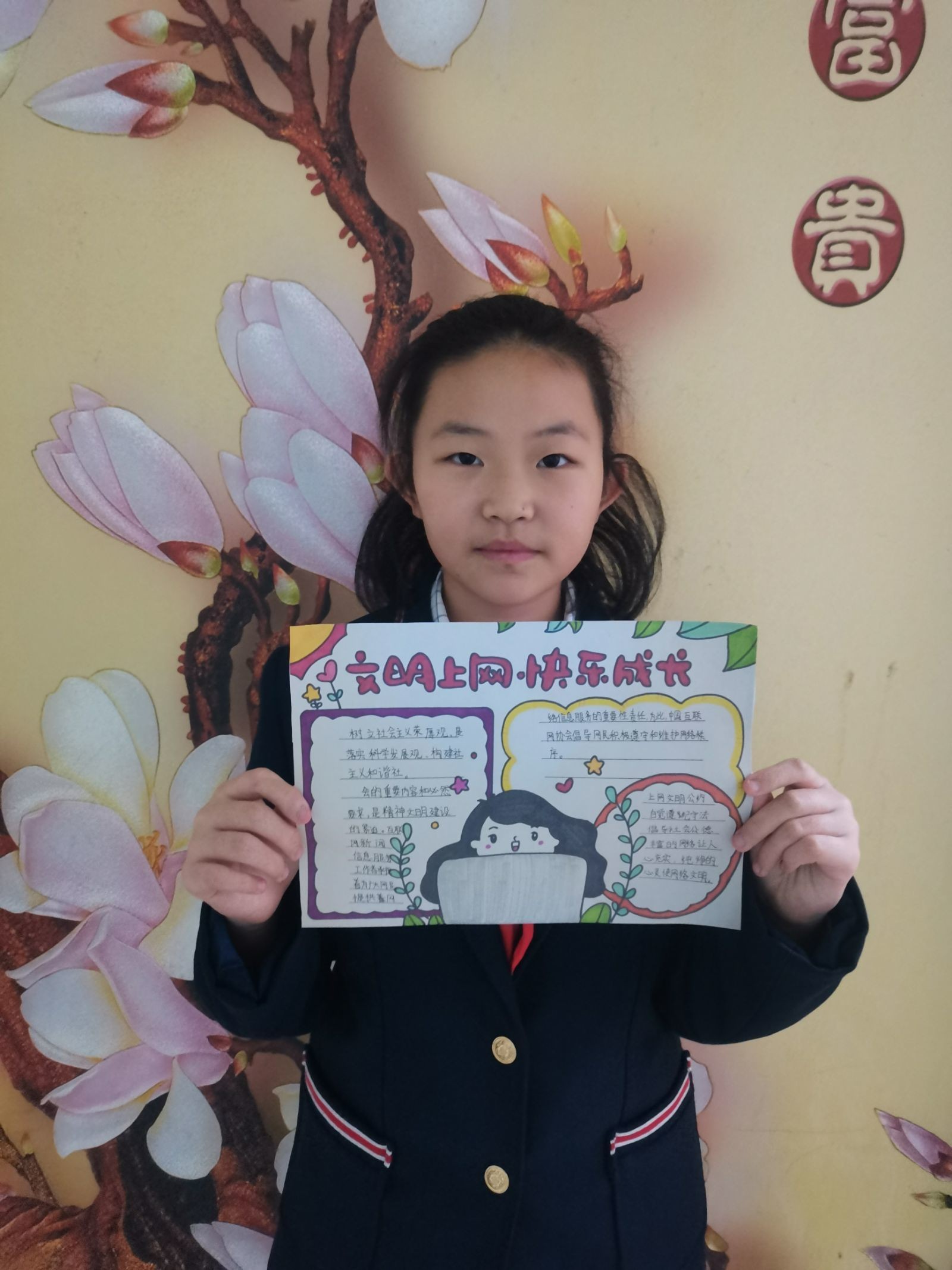 同学们通过绘制手抄报的形式向身边人发出文明上网的倡议,呼吁身边人自觉抵制不健康的网络行为,提高网络安全意识和防护能力。
