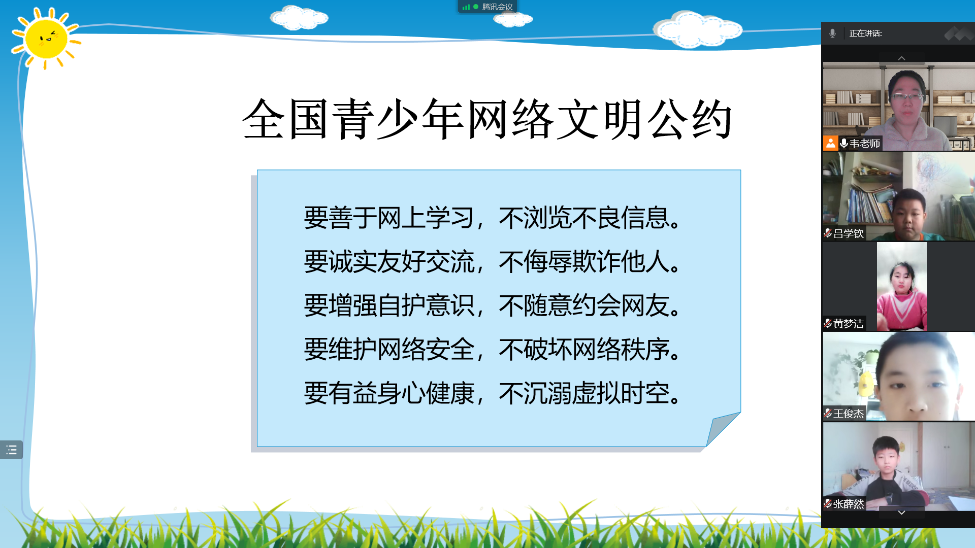 线上班会课,同学们全体起立,庄严宣读了《全国青少年网络安全公约》,坚决遵守网络文明和相关法律、法规,自觉维护国家网络安全,文明上网,理性使用网络智能终端设备,养成良好的用网习惯,不断提升自身网络素养。