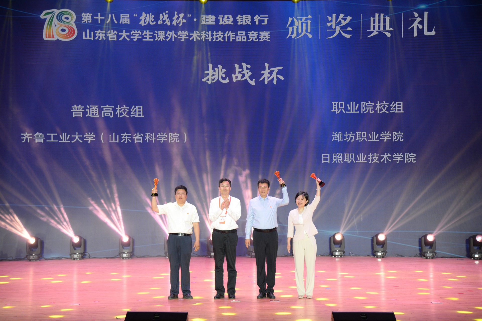 闭幕式公布了比赛结果,中国石油大学(华东)《震情卓识——基于北斗的地震监测及预警平台》、山东水利职业学院《用绿色技术之美引领乡村发展之变:农户对可降解地膜的支付意愿及其影响因素》等126件作品获得特等奖。齐鲁工业大学(山东省科学院)、潍坊职业学院、日照职业技术学院捧得竞赛最高荣誉“挑战杯”,山东财经大学等18所高校夺得“优胜杯”,山东大学(威海)等38所高校获得优秀组织奖。为表示中国建设银行对青年学生创新创业工作的大力支持,竞赛组委会向中国建设银行授予“鼎力杯”。