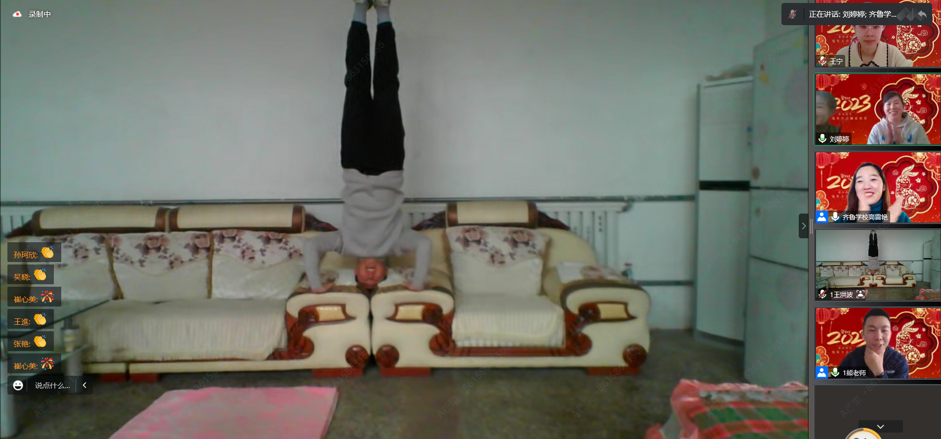 在线上教学期间,刘畊宏“火”到了卡塔尔,学校体育组也来“炫技”。“孙校长的姿势特别标准。”“还有谁的小手没有抬高?”“让我看到你们舞动的手臂和扭转的蛮腰。”有人示范、有人监督、有人评价,热烈的氛围下,全体人员在直播间“青春”了一把。