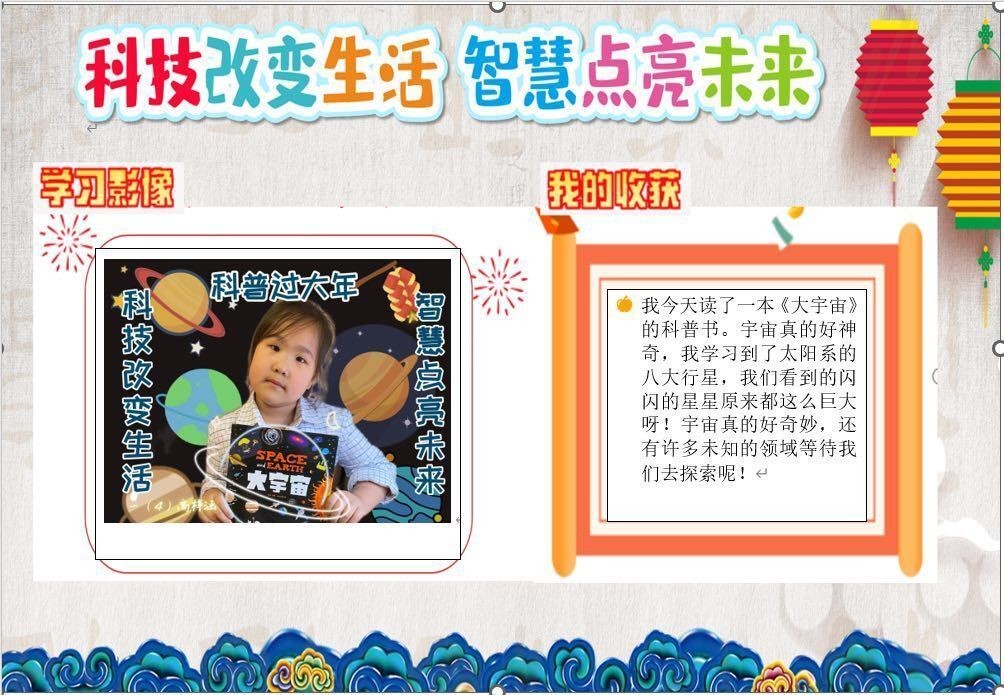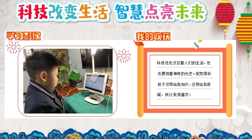 分享科普知识,交流学习心得成为了这个寒假中同学们最乐于做的事情,许多同学通过录制视频,制作科技小报的形式,将收获分享给身边的同学,也有的同学将自己寻访科技展的感受分享给大家。使同学们切实感受到科技改变生活,智慧点亮未来!