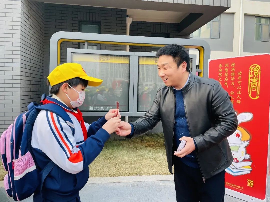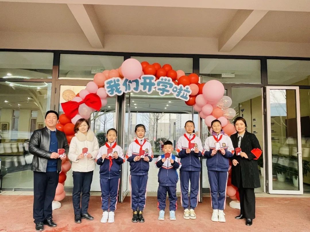 2月6日上午,济南市天桥区兴麓小学1942名学生,带着对新学期的美好期待,洋溢着笑脸走进校园。心愿卡、拱形门、合影墙……开学的仪式感充满了校园的角角落落。