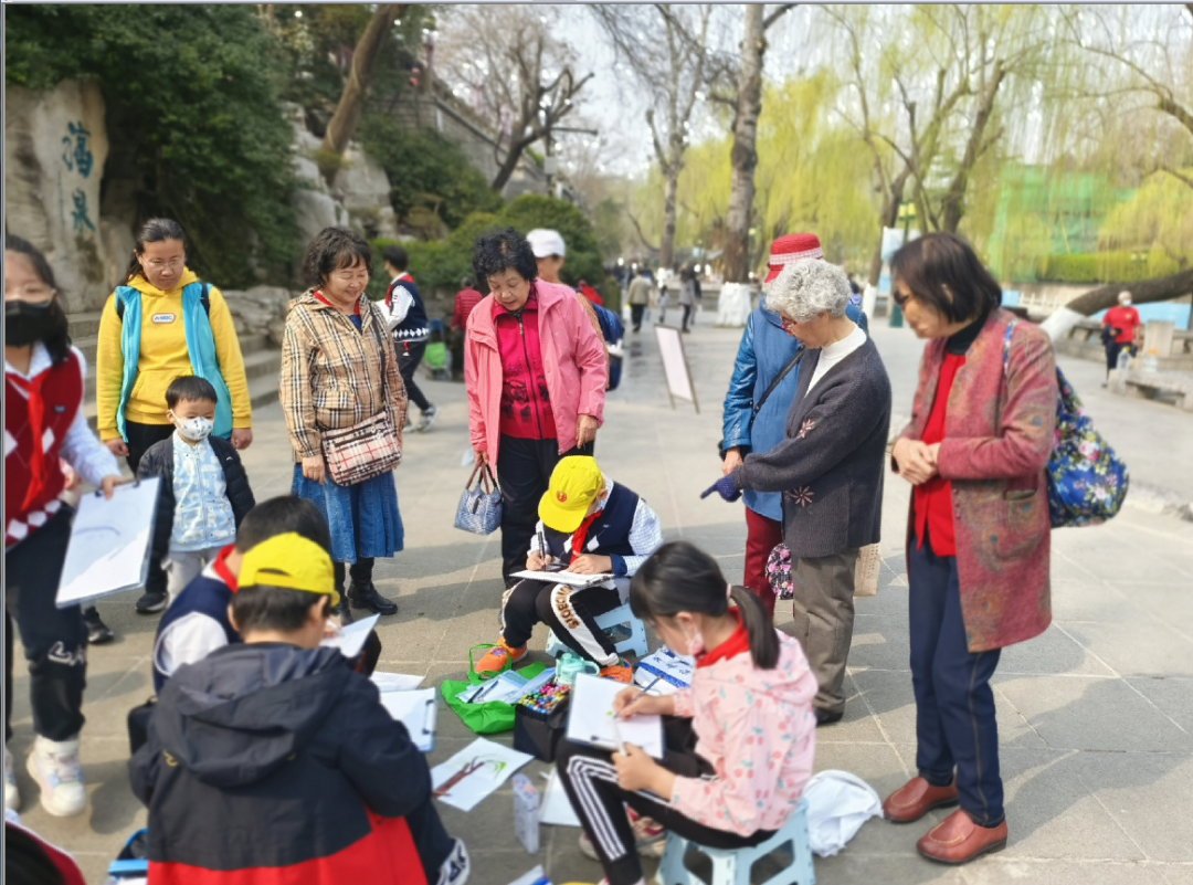 他们以护城河、黑虎泉等景点为参照物,将自己的感觉、感受、兴趣、情感以及观察融为一体,用自己独特的绘画语言表现出来。很快,泉水、小亭、垂柳、画舫,远处的解放阁等都活灵活现地跃然纸上。