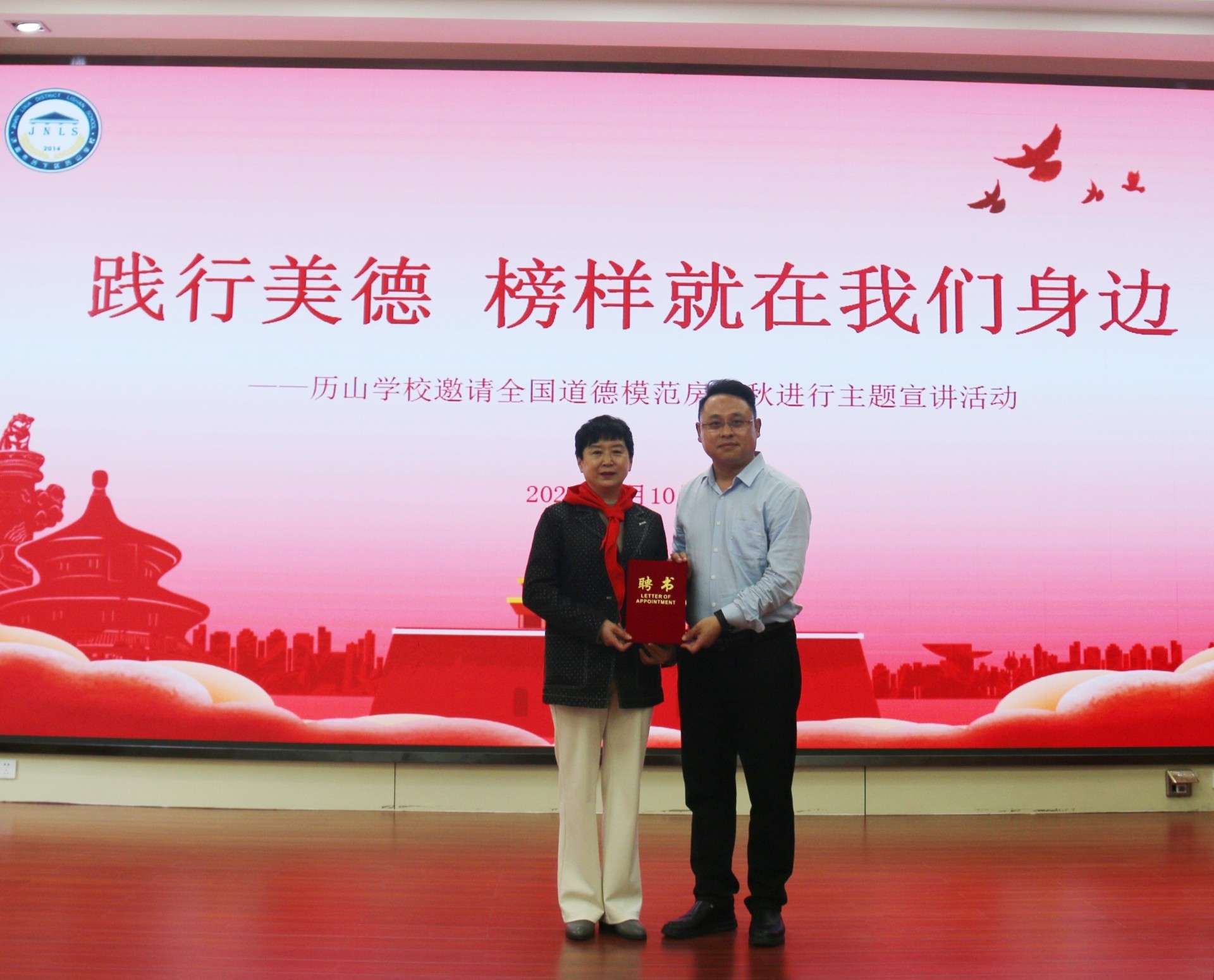 历山学校少先队员代表为房泽秋奶奶佩戴鲜艳的红领巾,校长为她颁发校外辅导员聘书并赠送鲜花,希望同学们以她为榜样,成为“乐于奉献”的新时代少年。