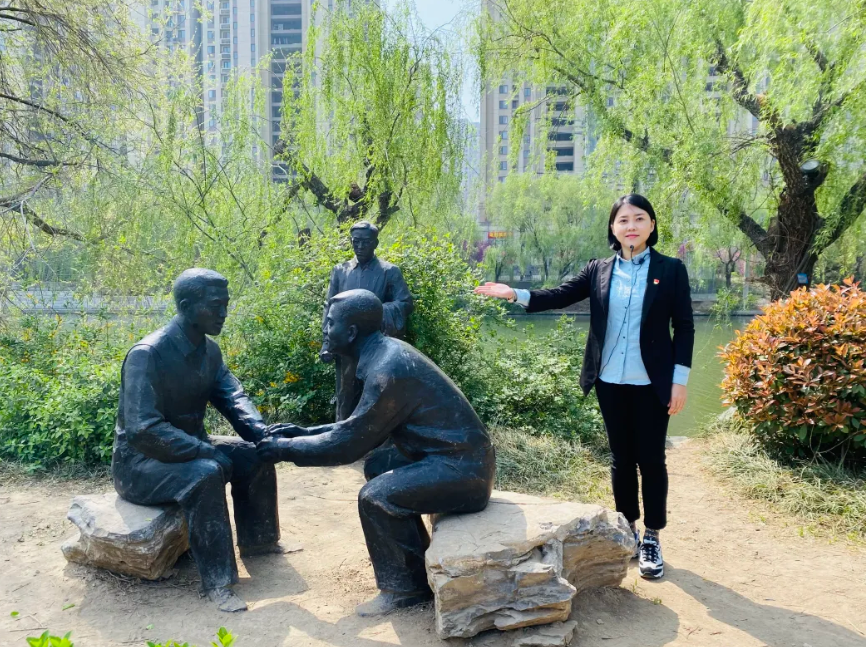 随后,大家来到党史纪念地雕塑,雕塑上是醒目的1934,昭示后人铭记中共济南市委在五柳岛重建的岁月。青年团员教师王宇老师介绍了党史纪念雕塑的碑文和历史意义。