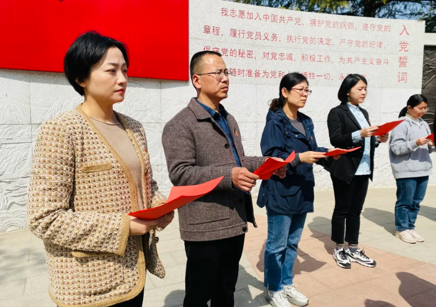 全体党员教师面对宣誓墙鲜艳的党旗在此重温入党誓词,鲜红的党旗、铿锵有力的誓词,激励着党员教师们时刻牢记自己的身份和责任,砥砺前行、发挥党员的先锋模范作用。