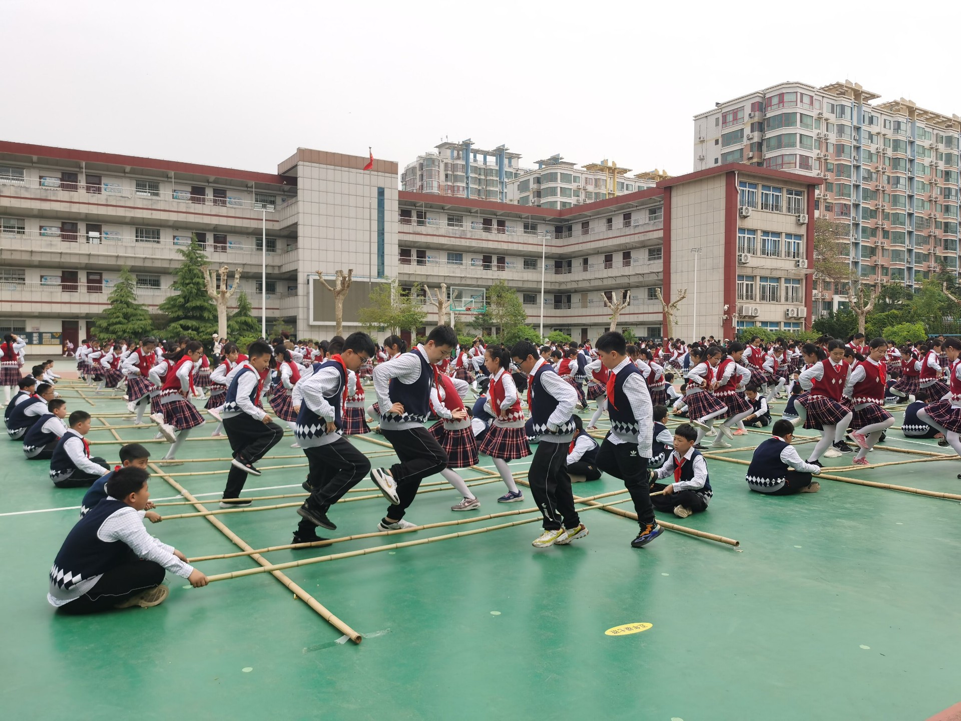 近日,济南市燕柳小学一大群孩子在近400根竹竿组成的矩阵,学生们“跳”出了、“跳”出了童年的快乐、“跳”出了自信团结。不拘一格的“花式竹竿舞”大课间正成为燕柳校园一道亮丽的风景线。