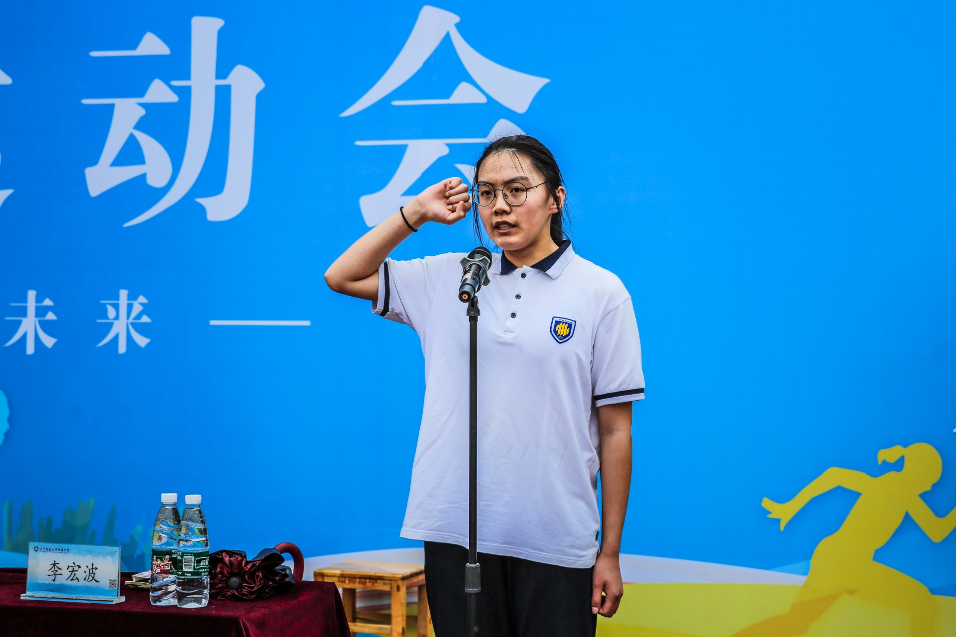 运动员代表高二17班崔灿宣誓:全体运动员将在本次运动会践行体育精神,遵守比赛规则,赛出水平、赛出风采!