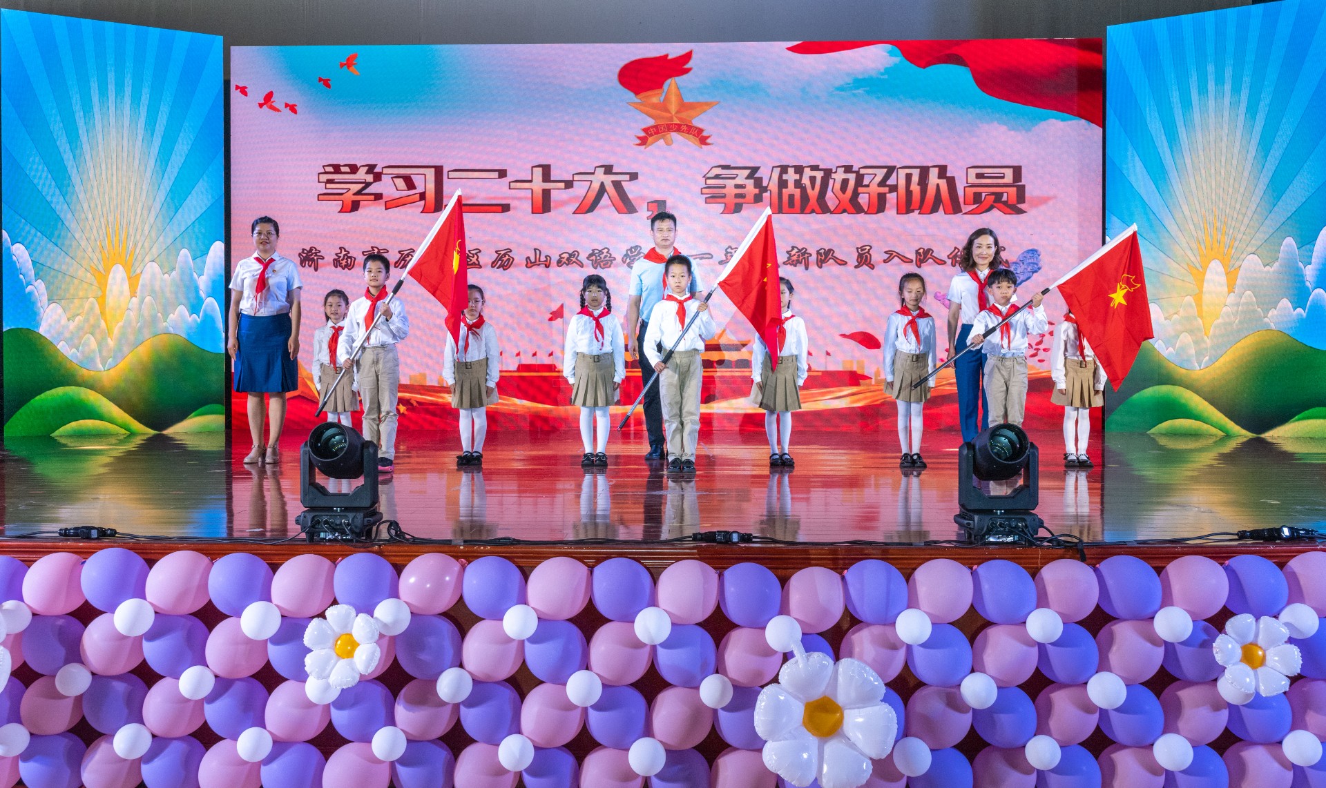 伴随着激昂的少先队出旗曲响起,“学习二十大 争做好队员”历山双语学校一年级新队员入队仪式正式拉开序幕,一年级的新队员们注视着鲜艳的队旗,满怀期待地迎接入队的重要时刻。