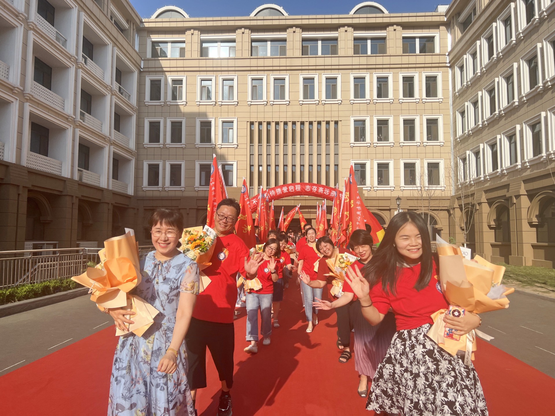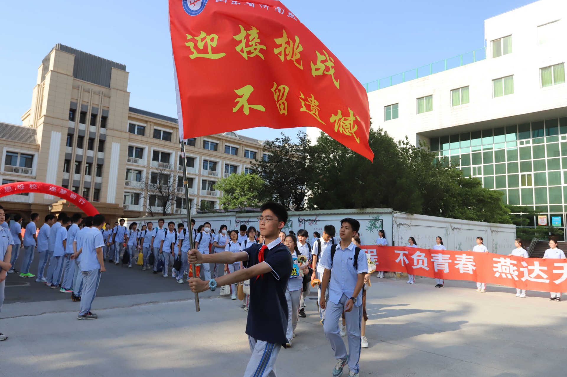 脚踏实地、挺膺担当,刻苦磨炼、励志勤学。初二各班学生代表从学哥学姐手中郑重接过鲜红战旗,誓用拼搏续写燕山荣光。“学考必胜,金榜题名!乘风破浪,马到功成!”在初二学弟学妹们激情洋溢的祝福声中,34级学生们带着母校的牵挂与期盼,昂首走过精心搭建的“旗开得胜门”,向着更美好的未来扬帆启程。