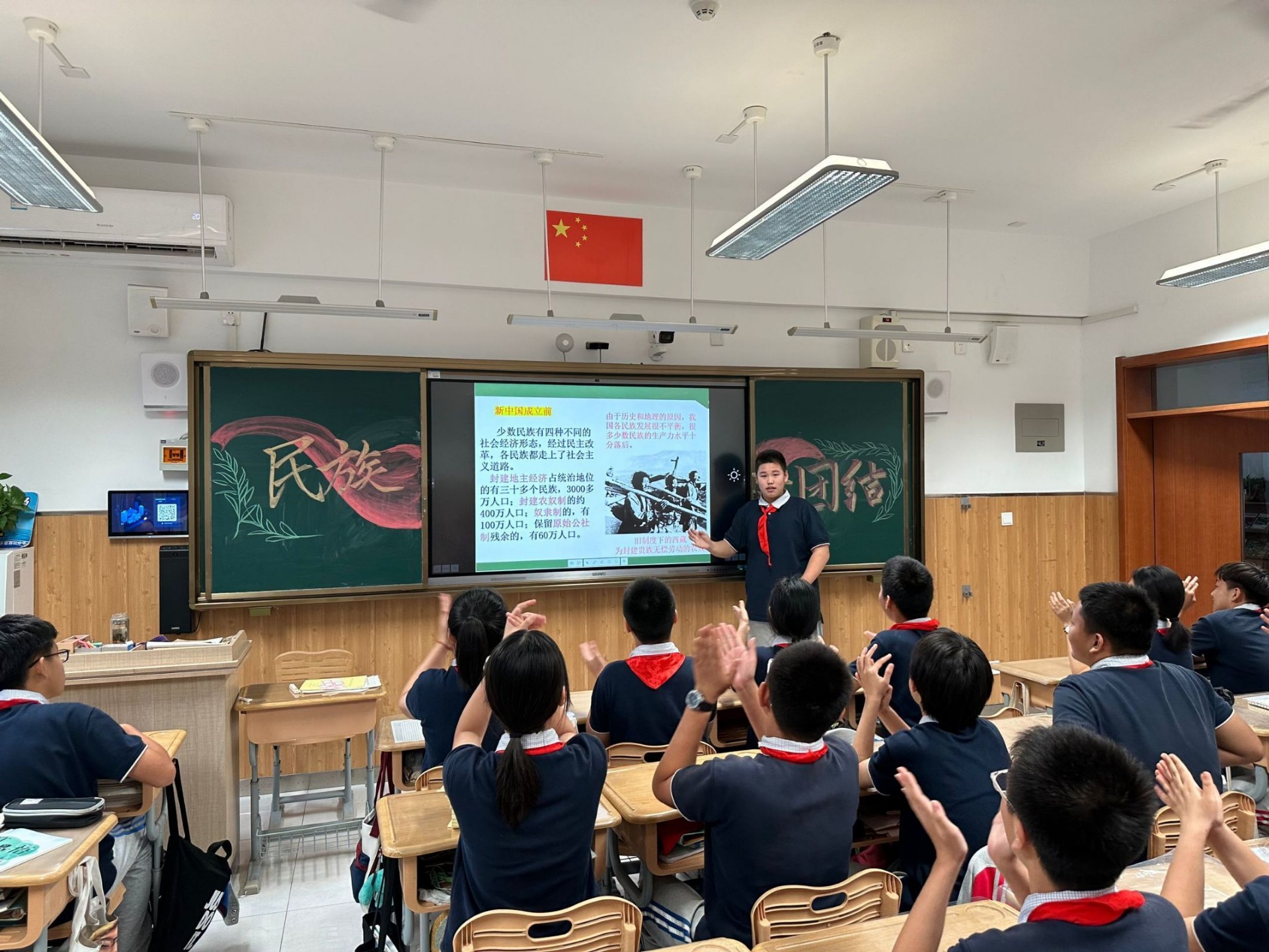 9月1日,面向全体学生开讲新学年“民族团结第一课”,同时开启民族团结进步宣传教育活动。9月18日,各中队开展主题少先队活动课,引导学生树立正确的祖国观、民族观,广泛宣传全国推广普通话宣传周设立的意义,以展示普通话的语言感染力和吸引力为主调,组织开展书香校园经典诵读等活动,增强学生“五个认同”,厚植中华民族共同体意识。
