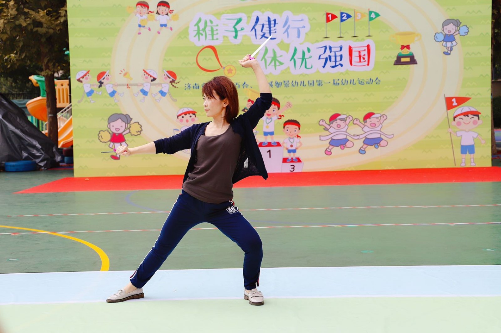 幼儿早操活动中以走跑走、武术操及操后游戏共同组成,此次展现的是走跑走及操节评比,以小班组、中大班组分组进行,教师作为幼儿的榜样,展现着武术强有力的精神面貌,小班以“拳”为基本动作展开,中班在徒手操的基础上增加了“掌”的运用,大班的操节增加器械“匕首”,展现武术动作的磅礴气概。针对不同年龄阶段,展现不同难度的武术章法,教师充分发挥带动作用,以促进幼儿全面协调发展,增进思维的敏锐度。