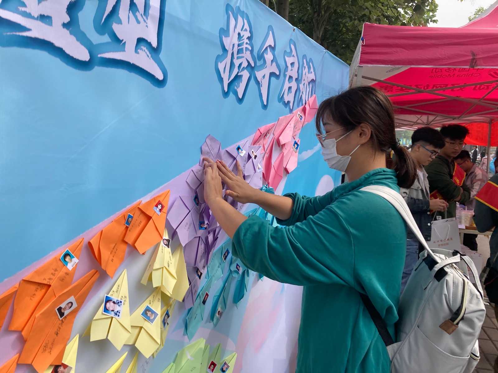 而在迎新点,各学院、职能部门的工作人员和学生志愿者也早已准备就绪,设计了丰富的迎新活动。“天工开物匠心独运”签名墙和“梦想,从这里起航”迎新墙前,吸引了若干新生驻足,签名拍照留念。