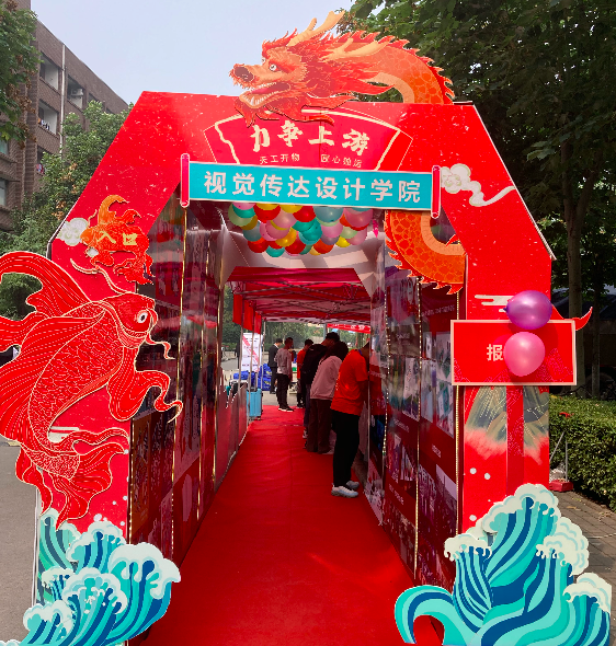 追着锦鲤来报到!本次迎新中,视觉传达设计学院的同学们利用专业所长,定制的一整套“锦鲤跃龙门”的视觉设计非常吸引眼球。从地标到展板,从指示牌到连廊,都是统一的红色底板配上金光闪闪的锦鲤风格。“此次选择‘锦鲤跃龙门’ 的视觉创意,一是祝贺2020级新同学进入理想的大学,同时,‘锦鲤’在近年来年轻人的文化中象征着好运,希望新生在此后的大学生活中能学有所成、心想事成。”负责本次迎新活动的学生介绍说。此外,视觉传达设计学院还通宵为新生制作了视觉专属时光隧道。同学们步入隧道,可以直观地了解视觉传达设计学院的发展历史历程、专业设置情况,激发学生的专业认同感。