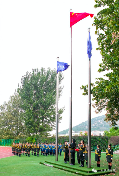 10月1日,山东艺术学院在长清校区田径场举行升国旗仪式,庆祝中华人民共和国成立71周年,学生处相关负责同志、长清校区各二级学院值班老师和2020级新生同学参加仪式。