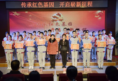 育秀中学小学部特邀特级飞行员李志民爷爷,为全校少先队员传承红色基因。泉泽小学的开学典礼上,党团队三旗在少先队员上方传递,学校还特邀两位老英雄与少先队员共同升国旗。济南市经八路小学的学生则通过“百句心里话”“百书阅读者”“百首红歌唱”等形式,展五育风采。