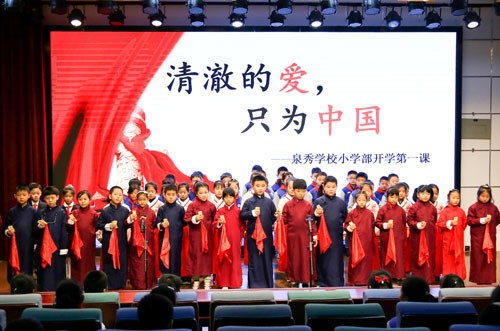 昨日,在济南市市中区泉秀学校小学部,学校举行了以“清澈的爱,只为中国”为主题的开学典礼。记者 王晓峰通讯员 郭忠杰 摄