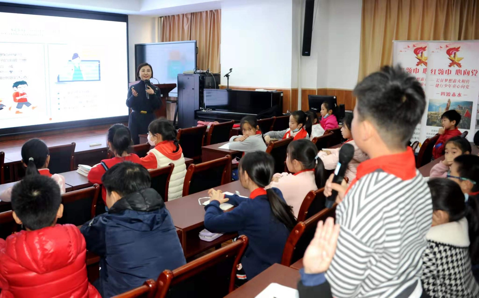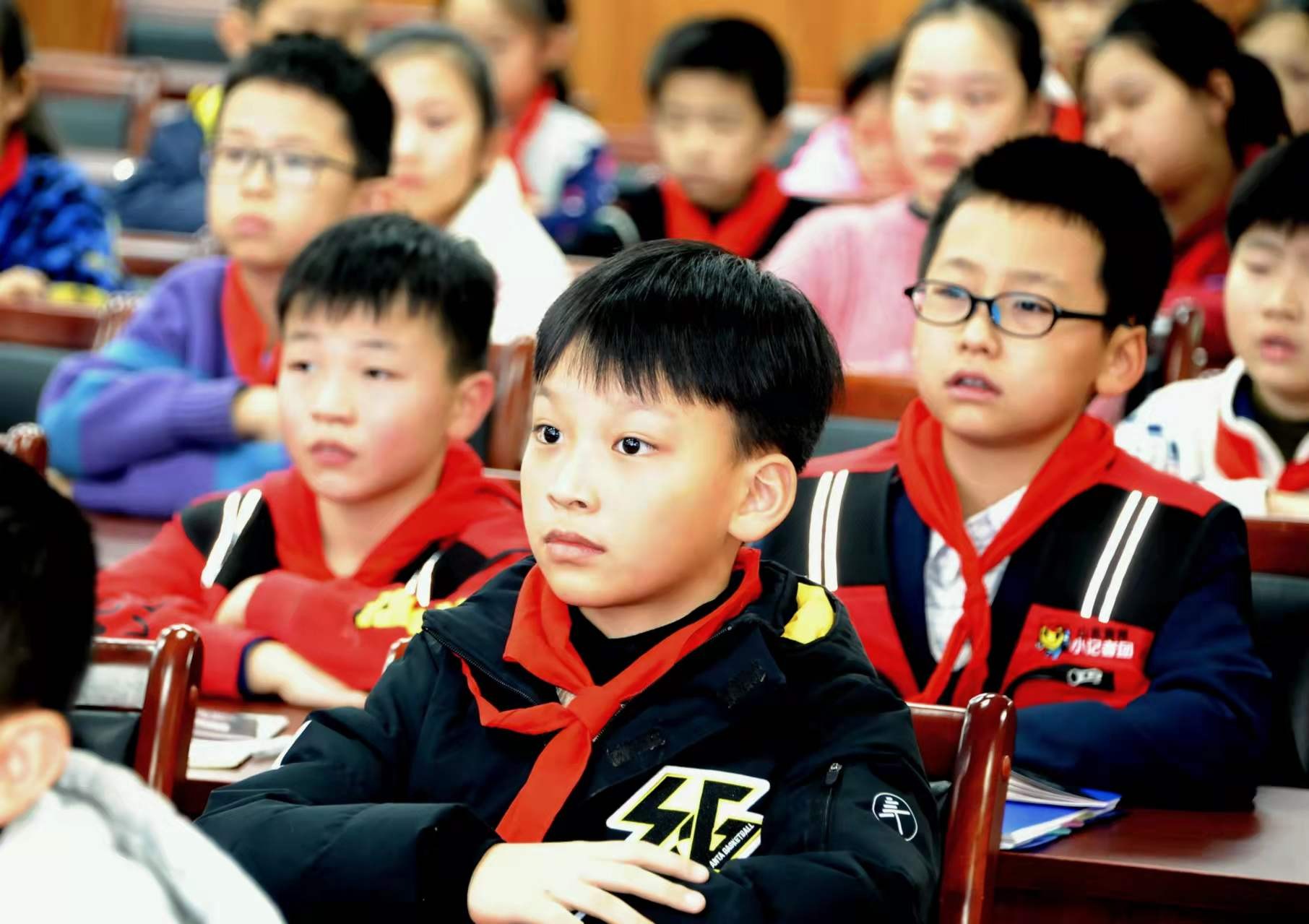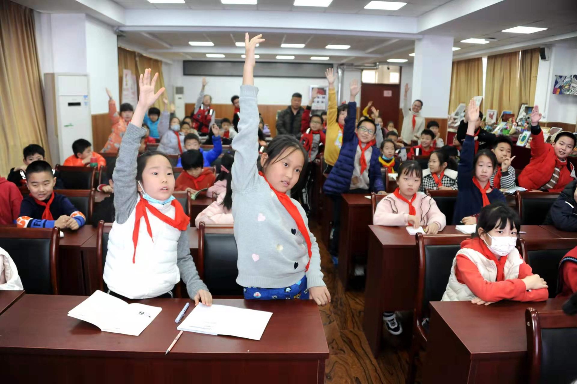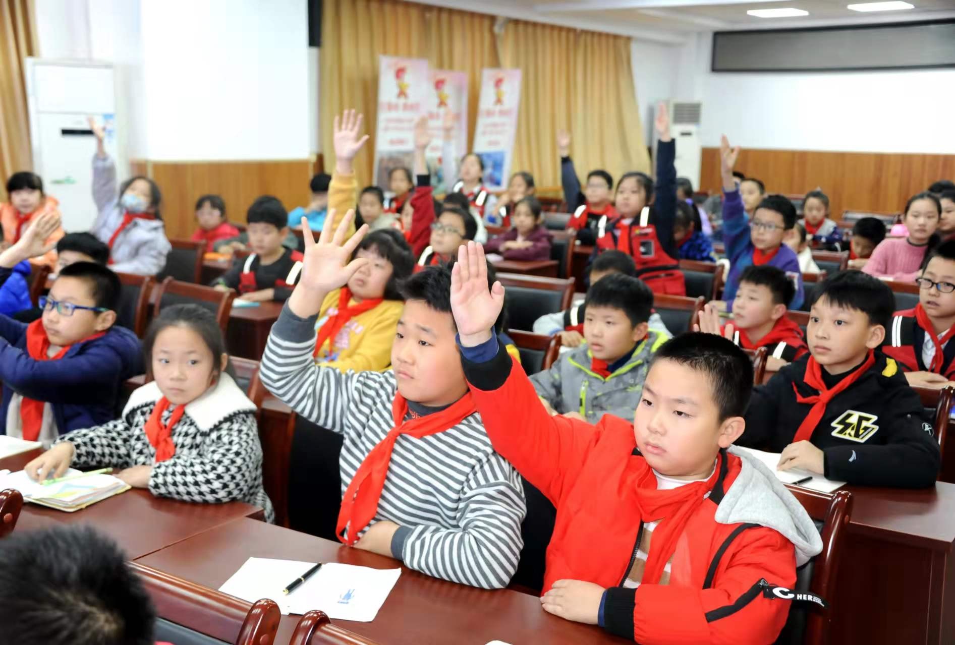 小记者们听得津津有味,不时在笔记本上记录要点,同时发动脑筋,思考如何提问问题。当听到“主持人”宣布进入提问环节后,小记者们立马把小手高高举起,在第一时间争取提问机会。