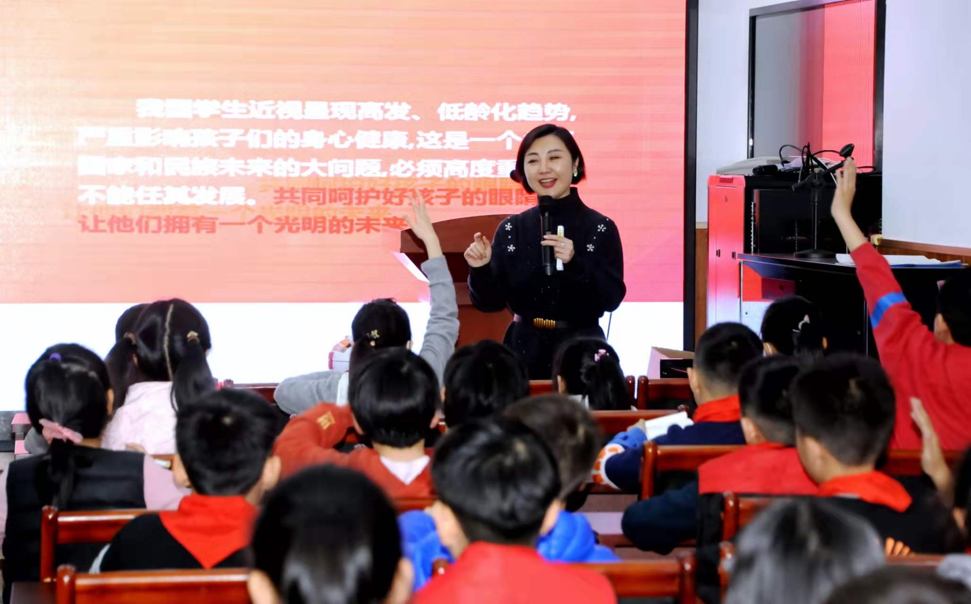 “手机上的护眼模式有用吗?”“最好多久更换一次眼镜?”“角膜塑形镜有危害吗?”“小学生可不可以戴美瞳?”……模拟记者会上,围绕“保护视力 远离近视”主题,小记者们专注倾听、积极举手、踊跃提问,过足了一把“小记者瘾”。